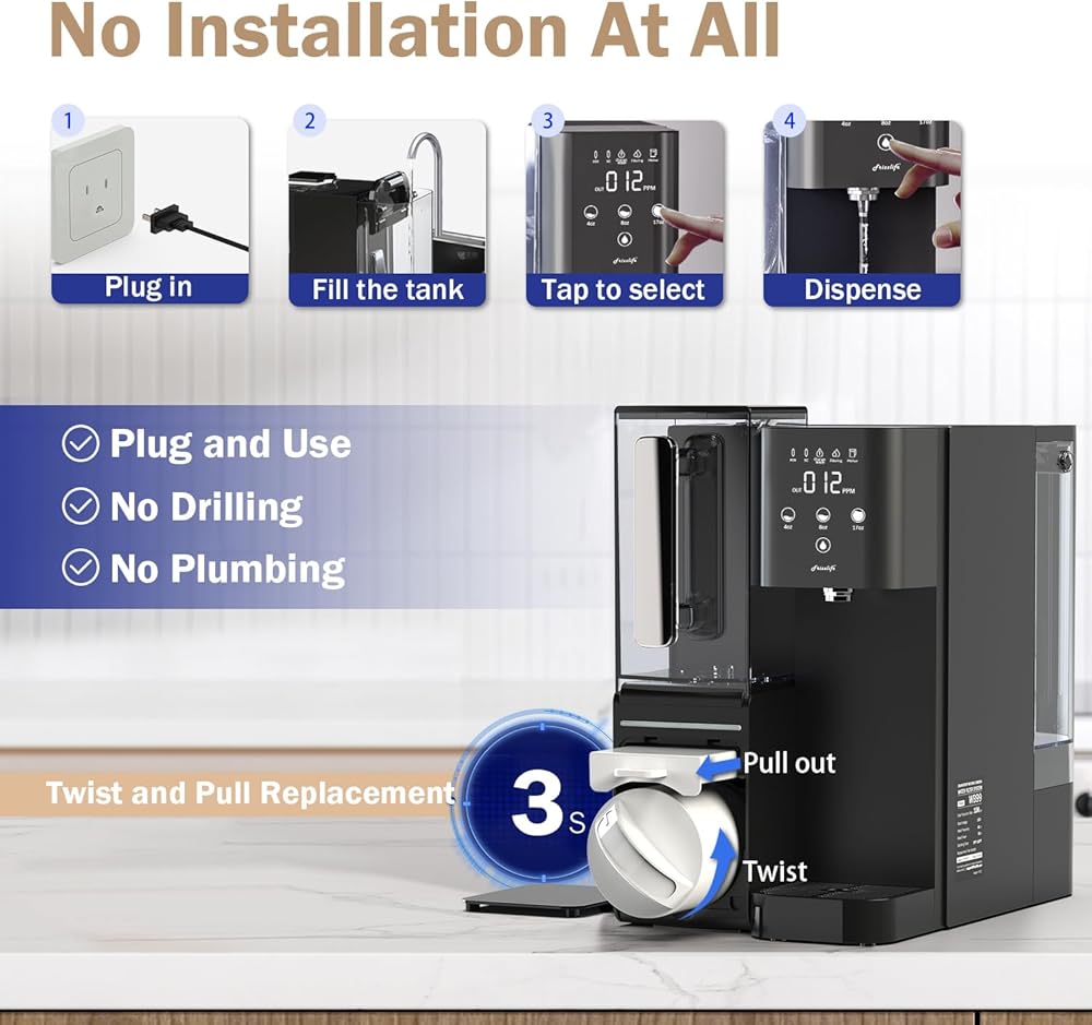 【إبريق محمول مزود بمياه RO】إبريق الماء المصفى قابل للحمل ويمكن أخذه إلى أي مكان يحتاج إليه. ليست هناك حاجة للذهاب إلى النظام في كل مرة لجلب الماء، فقط ضع الإبريق في متناول اليد. يمكنك أيضًا وضع الإبريق في الثلاجة للحصول على الماء المثلج! بفضل حجمها الصغير (9 بوصة طول × 16.5 بوصة عرض × 14.8 بوصة ارتفاع)، يمكن وضعها في سيناريوهات متعددة، مثل غرفة المعيشة والمكتب وغرفة النوم والمركبات الترفيهية والمزيد. ويمكن أيضًا دمج التصميم الأنيق بشكل متناغم في ديكور المنزل.