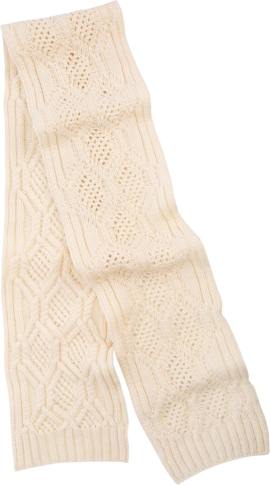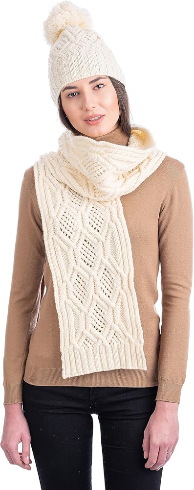 • Aran stitching patterns: The scarf and hat in this set both feature authentic cable Aran patterns, which represent the fishermen's wish for safety and good fortune. The hat also features diamond stitches, which are symbolic of the farmer's hope for luck and wealth. Additionally, the blackberry stitches on the scarf symbolize the power of nature.