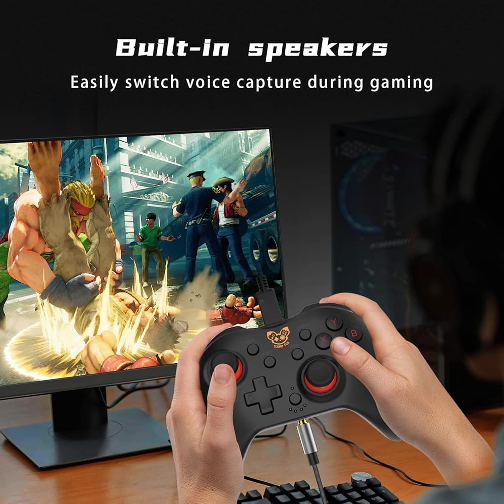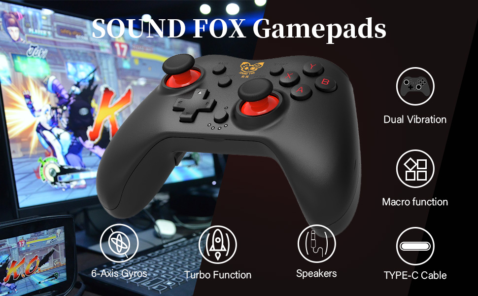 The SOUND FOX wireless switch game controller built-in six-axis gyroscope with 360°motion controll, its 3D joysticks are more sensitive, precise, and responsive thann others(Only switch mode support this function)