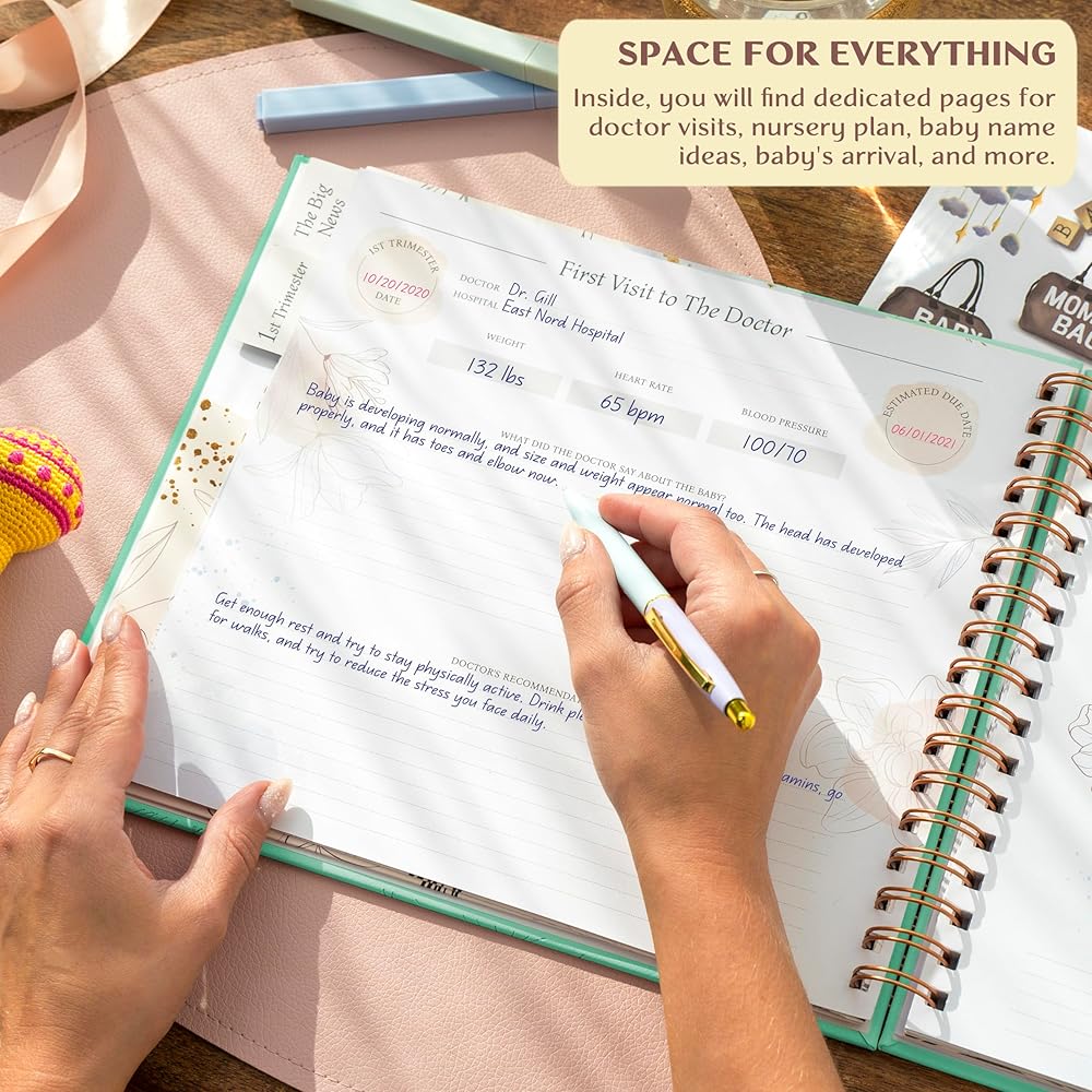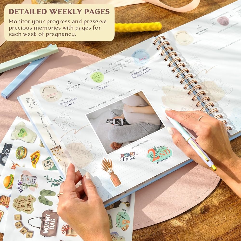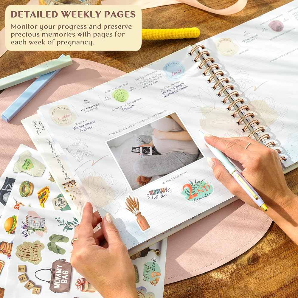 التقط كل لحظة من حملك - سيساعدك كتاب ذكريات الحمل هذا على توثيق كل مرحلة من مراحل حملك، منذ اللحظة الأولى. ستجد داخل دفتر سجل الحمل مطالبات يومية ومساحة واسعة للصور والذكريات.