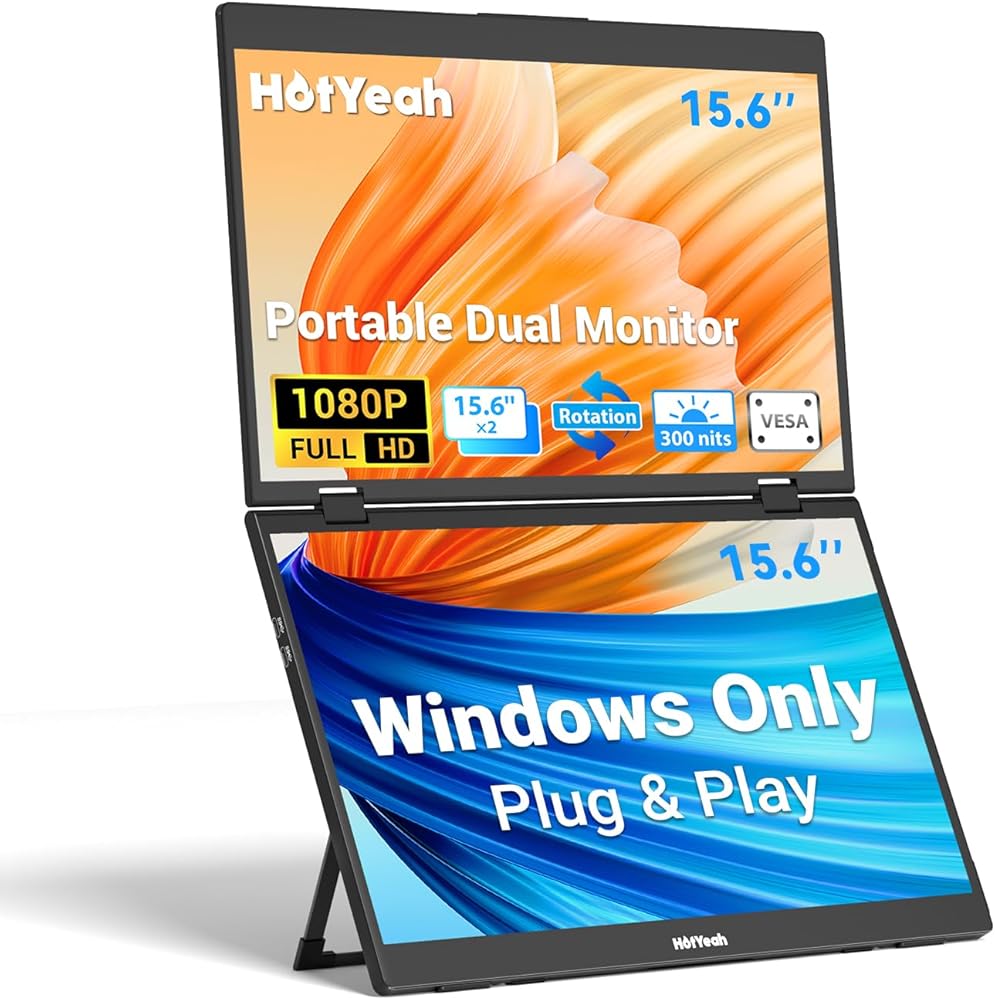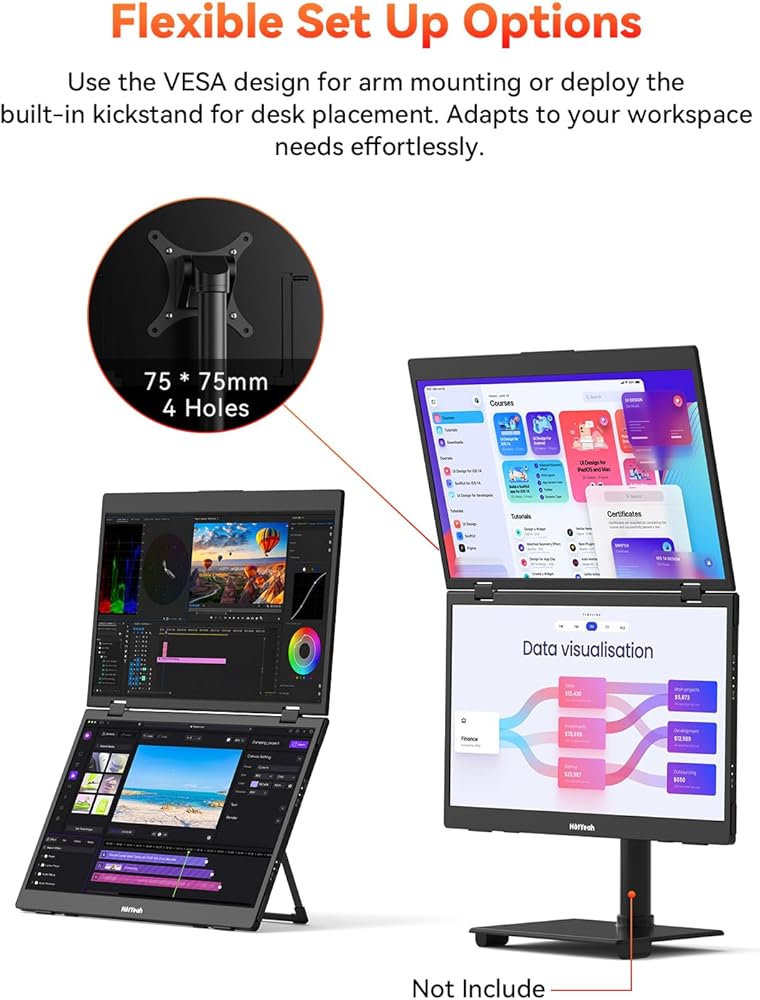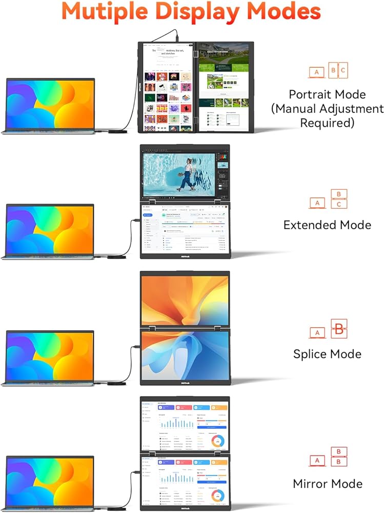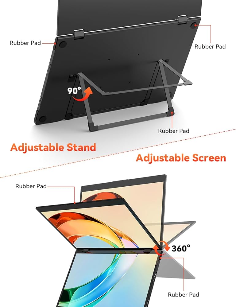 Portable & Ergonomic Design - Features a 90° adjustable stand, 360° rotatable upper screen, and individual screen setting for optimal viewing angle in any situation. Simply press Screen Rotation button to flip the dual screen 180° during face-to-face discussions. Just toggle the Mode Switch button, and change extend or split mode in a second, meeting most of your flexible mode needs. With 3.2lbs lightweight and 3.1-inch slim frame, it's the perfect triple portable monitor to take on the go.