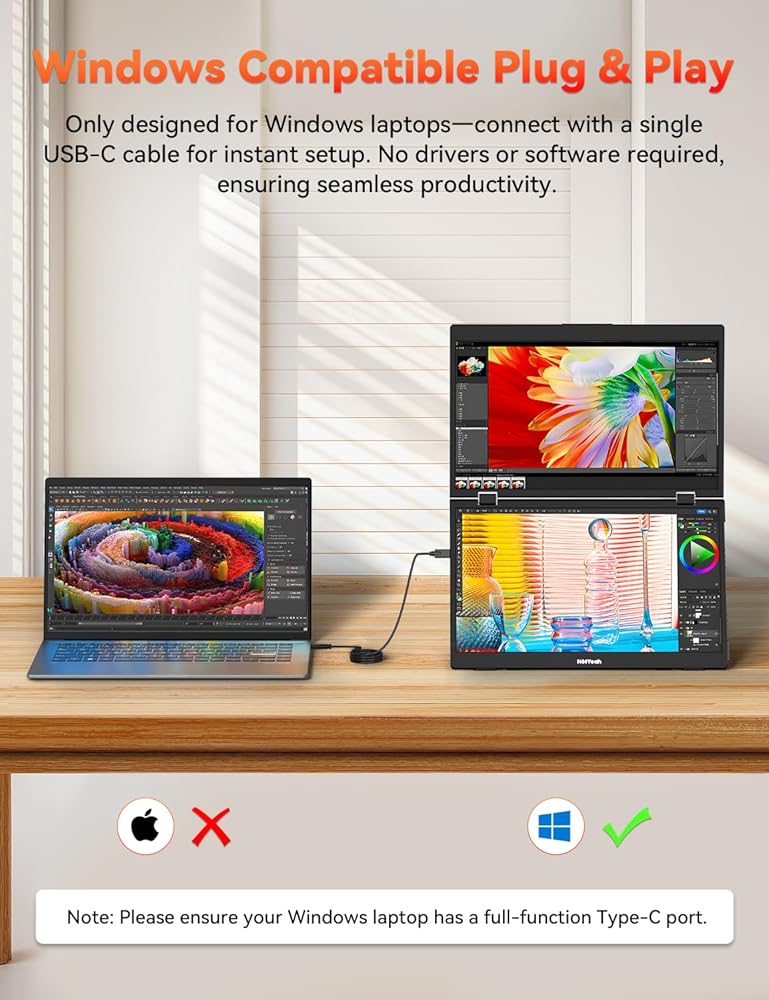 True Plug & Play - HotYeah laptop screen extender features a Mini HDMI port, a macOS Video Output Port, and dual USB Type-C ports. Effortlessly connect HotYeah laptop extended monitor via USB-C or HDMI cable for instant plug-and-play connection. Innovative HDMI port design makes older version laptops get a full screen too. No driver or APP is needed, suitable for easy on-the-go travel dual-monitor setups. Note: Your device needs support Thunderbolt 3.0/4.0 or USB 3.1 Type-C DP ALT-MODE.