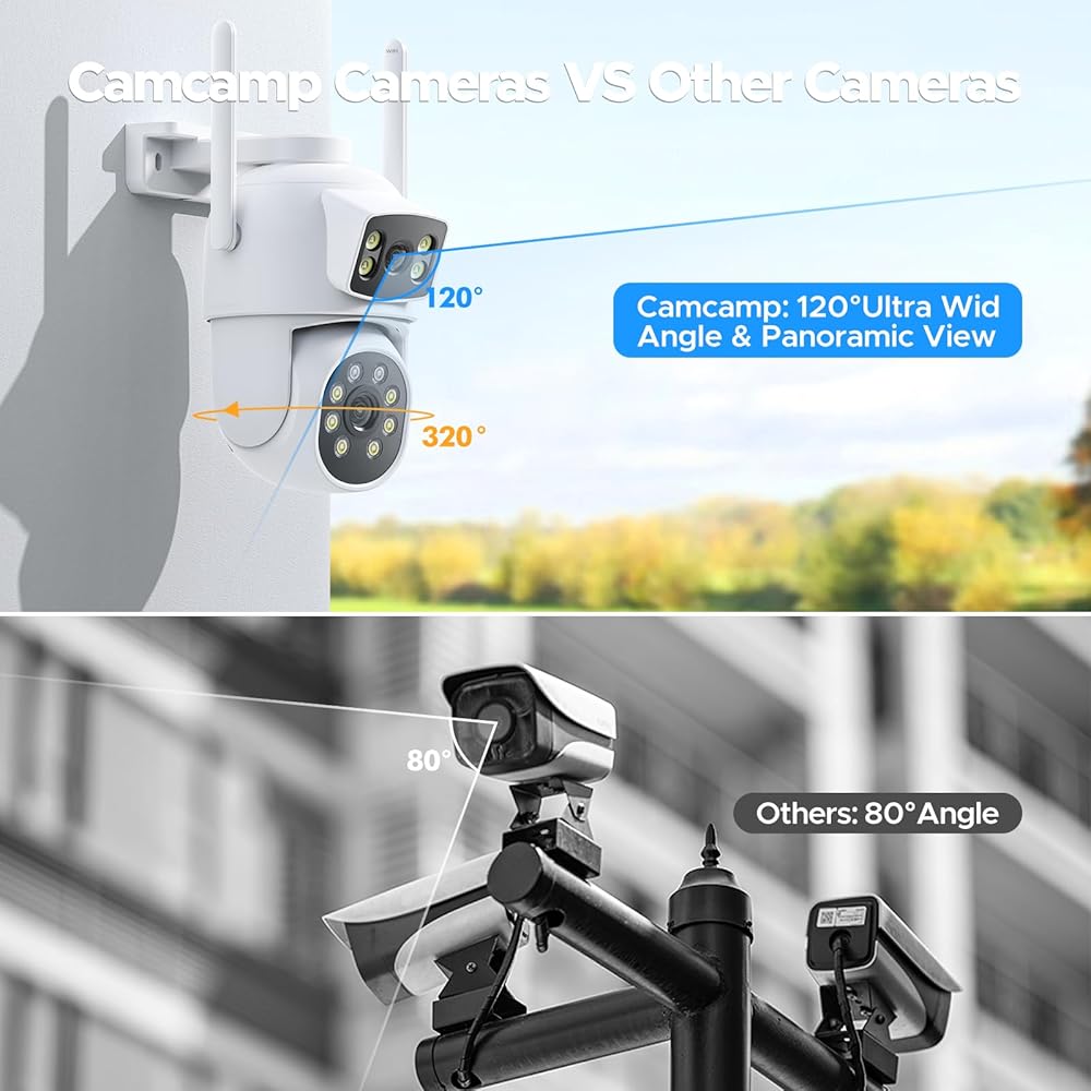 【كاميرا أمان مزدوجة الشاشة ذات عدسة مزدوجة 】نظام كاميرا أمان لاسلكي خارجي من Camcamp مع عدسات مزدوجة 4.0 مم: توفر الكاميرا الرصاصة والكاميرا المقببة تغطية زاوية 360 درجة وصور UHD خالية من الزوايا الميتة حقًا. بروتوكول الاتصال للكاميرا الخارجية لأمن المنزل هو: 2.4/5G Wi-Fi، نوع الطاقة لكاميرا الأمن ptz اللاسلكية هو: سلك كهربائي