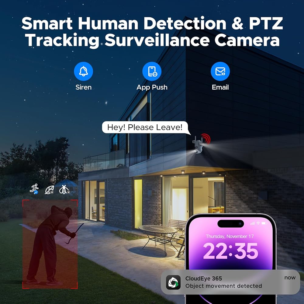 【مراقبة بانورامية وصوت ثنائي الاتجاه】يمكن تدوير كاميرات الأمان PTZ بزاوية 320 درجة أفقيًا و90 درجة رأسيًا، مما يغطي مجال رؤية 360 درجة لضمان رؤيتك بدون زوايا ميتة وتسجيل كل حركة للدخيل. يحتوي على ميكروفون مدمج ومكبر صوت هاي فاي (يعمل فقط على تطبيق "CloudEye 365")، مما يسمح لك بالبقاء على اتصال مع عائلتك عندما تكون بعيدًا وحماية عائلتك أو ممتلكاتك من الأخطار المحتملة