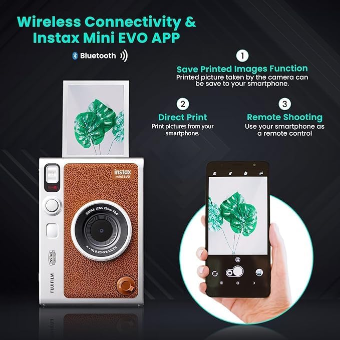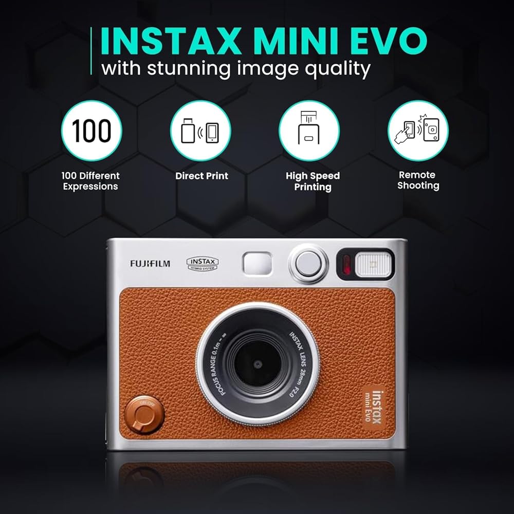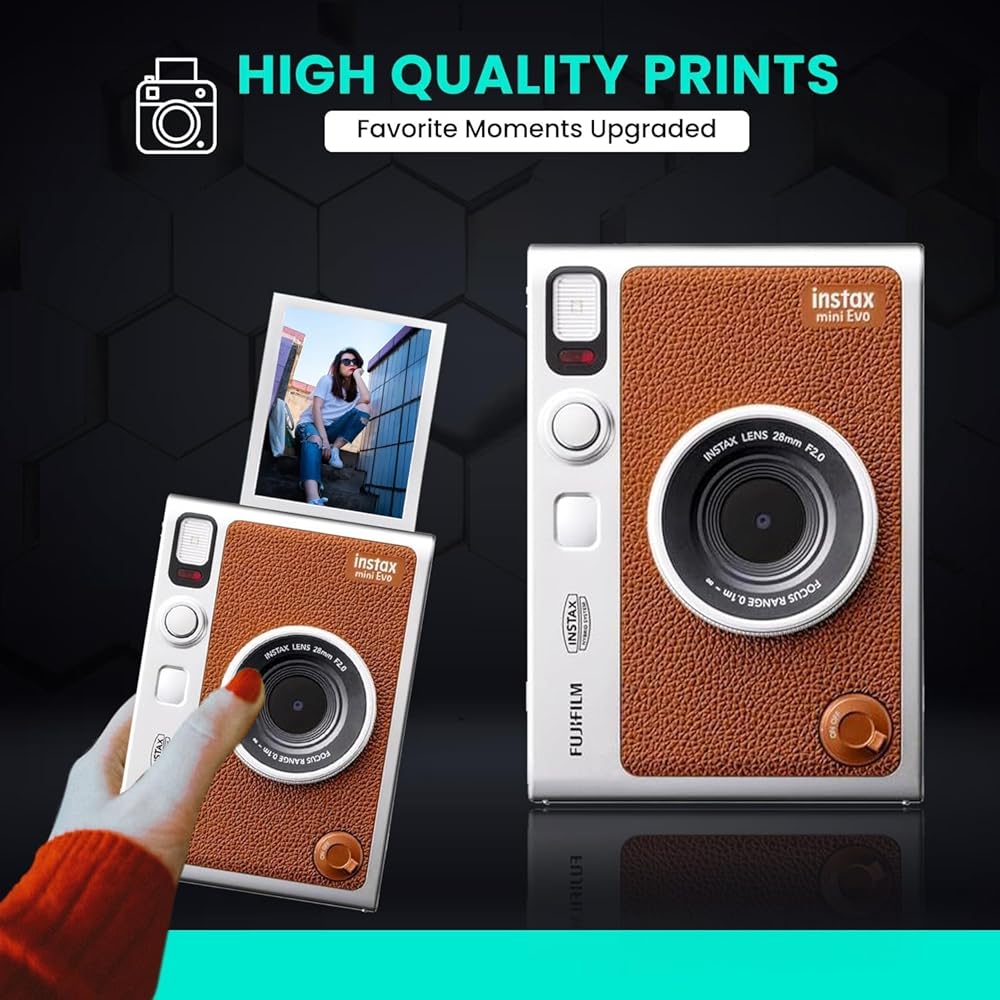 كاميرا بنية قديمة هجينة: تجمع كاميرا Fujifilm Instax Mini EVO بين التصوير الرقمي وتقنية الطباعة الفورية في تصميم بني كلاسيكي. إنه يلبي احتياجات عشاق التصوير الفوتوغرافي الحديث والرجعي، ويمزج بين التكنولوجيا المعاصرة والجمال العتيق.