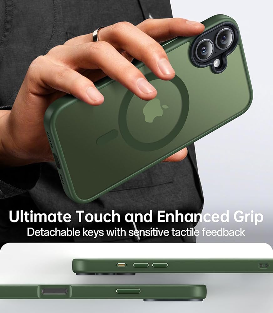Meifigno Designed for iPhone 16 Case 6.1", Compatible with MagSafe, Military-Grade Protection, Translucent Matte Back with Aluminum Alloy Keys, Shockproof Magnetic Case for iPhone 16, Alpine Green