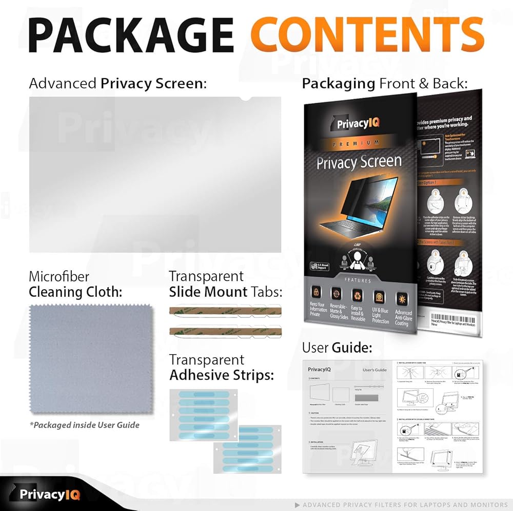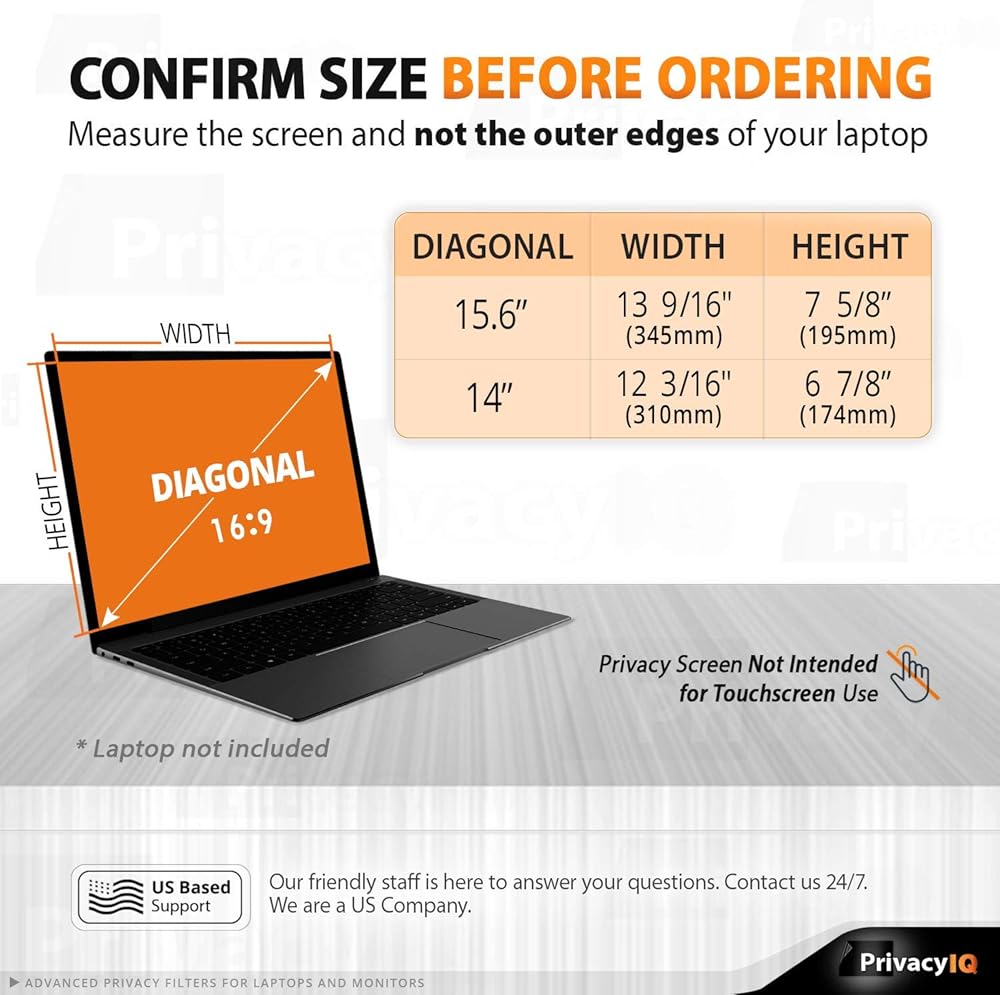 الأبعاد: PrivacyIQ 15.6 بوصة 16:9 نسبة العرض إلى الارتفاع الأبعاد على النحو التالي؛ 13 9/16 بوصة (345 ملم) في العرض، 7 5/8 بوصة (195 ملم) في الارتفاع، 15.6 بوصة قطريًا. تم تصميم شاشات PrivacyIQ لتناسب مجموعة متنوعة من الشاشات مقاس 15.6 بوصة بنسبة 16:9. من المهم جدًا قياس قياسات عرض الشاشة وارتفاعها والتحقق منها مرة أخرى قبل الطلب.