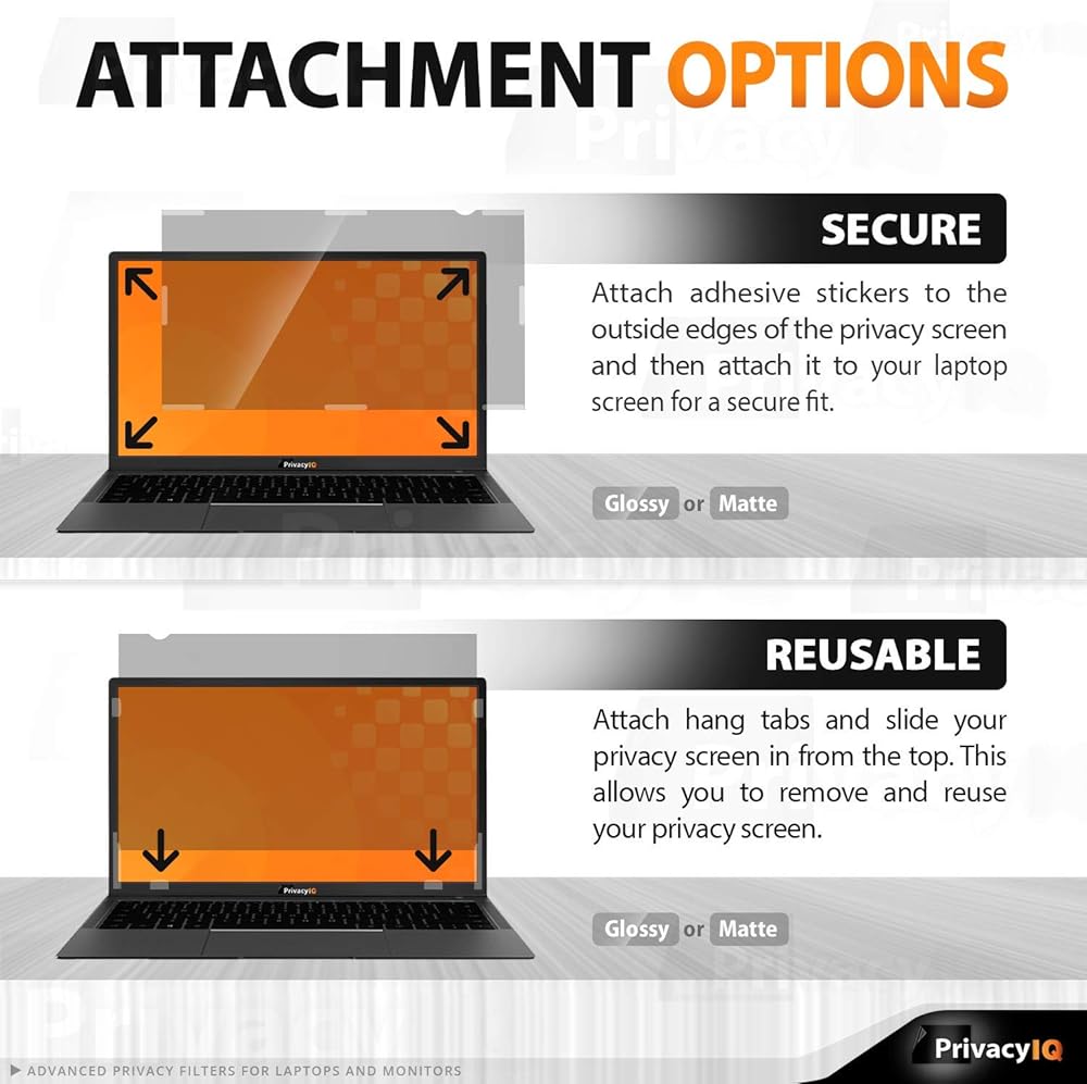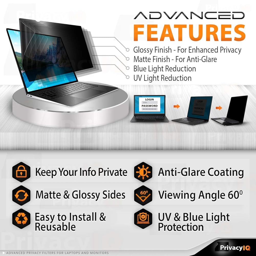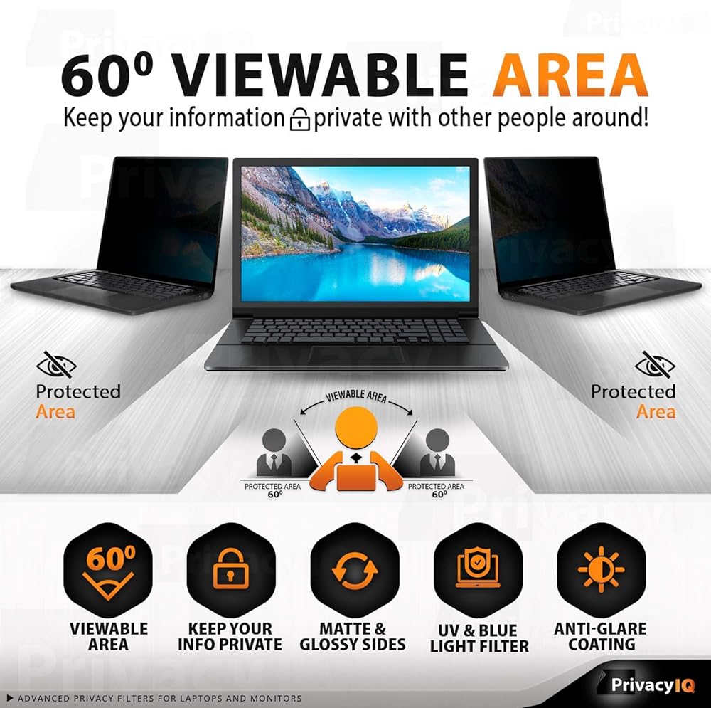 Privacy IQ 15.6 بوصة 16:9 مرشح شاشة خصوصية للكمبيوتر المحمول للخصوصية 60 درجة، مضاد للتوهج المتقدم، تقليل الضوء فوق البنفسجي وفلتر الضوء الأزرق؛ يناسب مجموعة متنوعة من أجهزة الكمبيوتر المحمولة بما في ذلك Asus Dell HP Lenovo