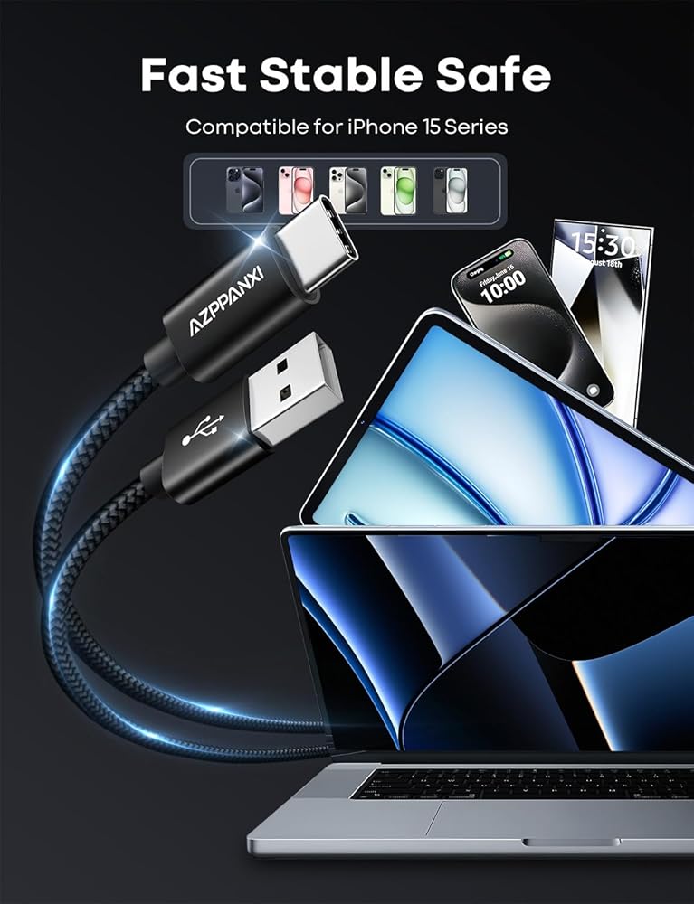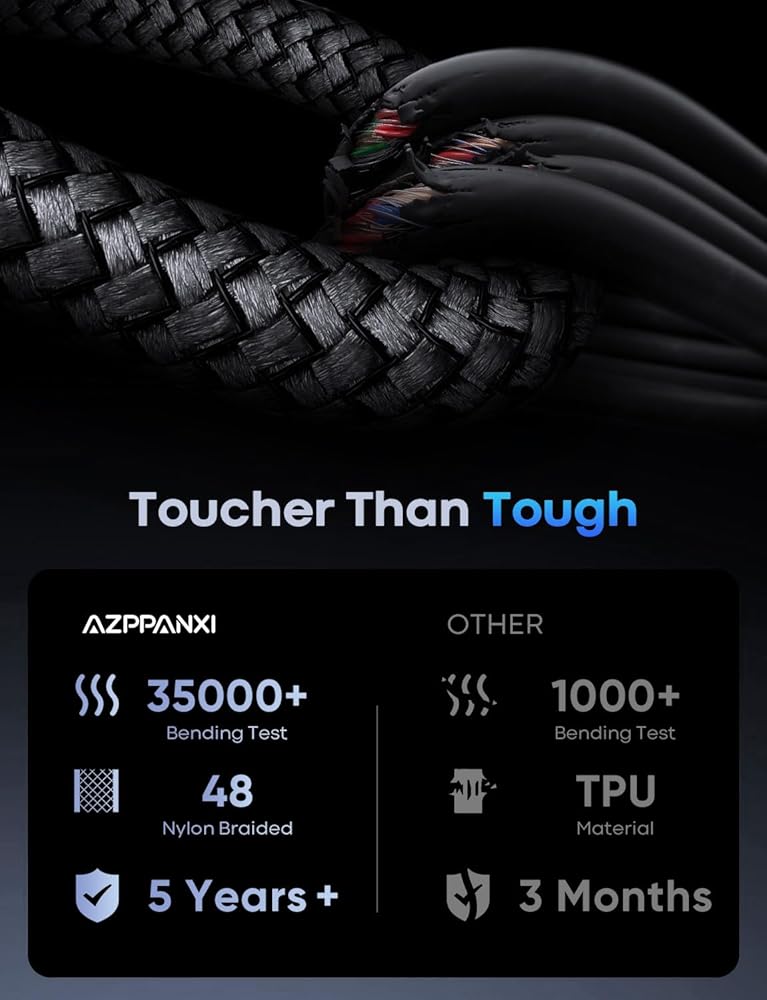 [Experience QC3.0 Fast Charging Support] - The AZPPANXI extra-long USB-C charging cable is compatible with all USB-C devices supporting QC 2.0/3.0 Fast Charging functionality. It offers faster charging speeds compared to numerous conventional longer cables.With a built-in 56K pull-up resistor and robust metal connectors, this cable ensures exceptionally reliable conductivity and stability.