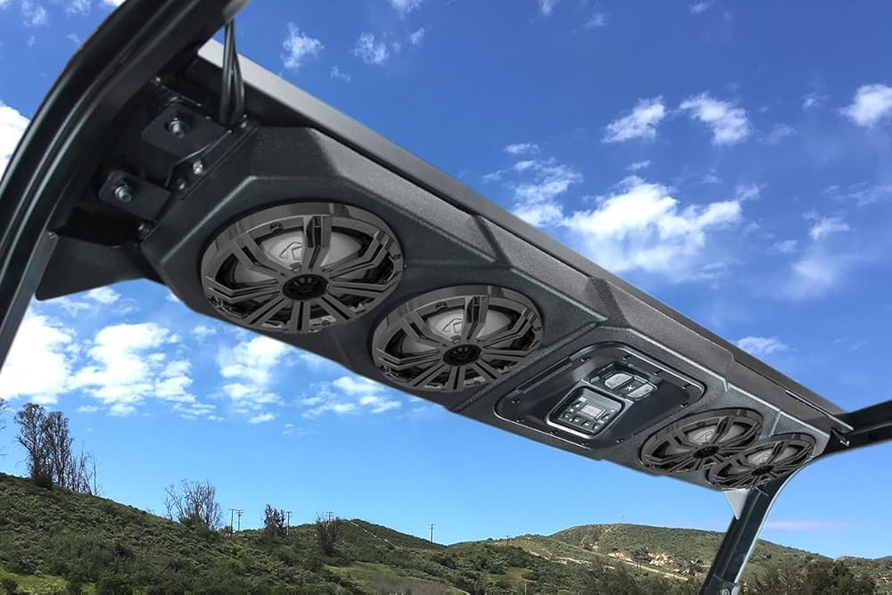 【WP Series】Our WP Series overhead soundbar for Rangers includes the enclosure, our MRB3 Bluetooth Radio with a 200watt, 4-channel amp, four Kicker KM 6.5" Speakers and a built-in overhead cabin light