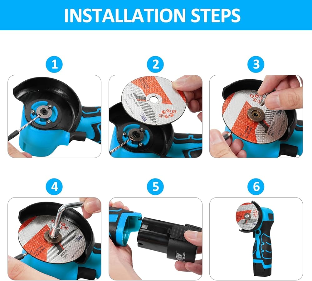 【Package Content/Wide Application】The grinder tool cordless package includes: 1x cordless angle grinder; 6x cutting wheels; 1x charger; 2x batteries; 2x wrenches and gloves. Handheld angle grinders can be used for grinding, cutting, grinding and polishing of a variety of materials, such as metal, tiles, concrete or other solid materials. Small angle grinders can also be used for home improvement, such as cutting and polishing tiles, wood, stone, steel, pipes, ducts, etc.