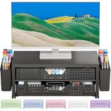توفير المساحة: يوفر حامل الشاشة المكون من طبقتين مع درج وحاملي أقلام معلقين مساحة تخزين واسعة للحفاظ على لوازم مكتبك وإكسسوارات مكتبك منظمة بشكل أنيق ويمكن الوصول إليها بسهولة، مما يحافظ على مساحة العمل الخاصة بك مرتبة ويحسن إحساسك بالرفاهية.