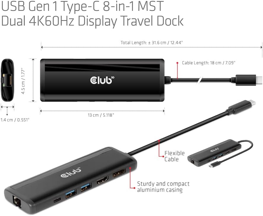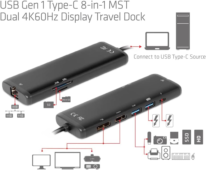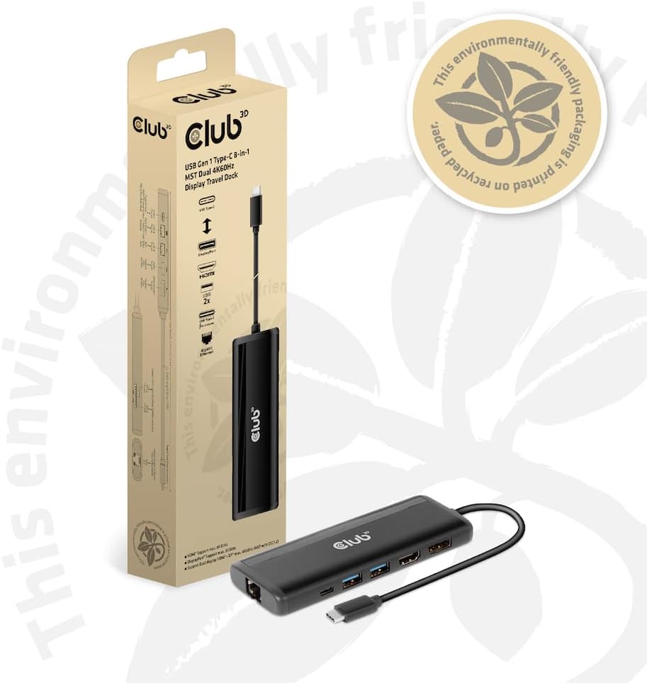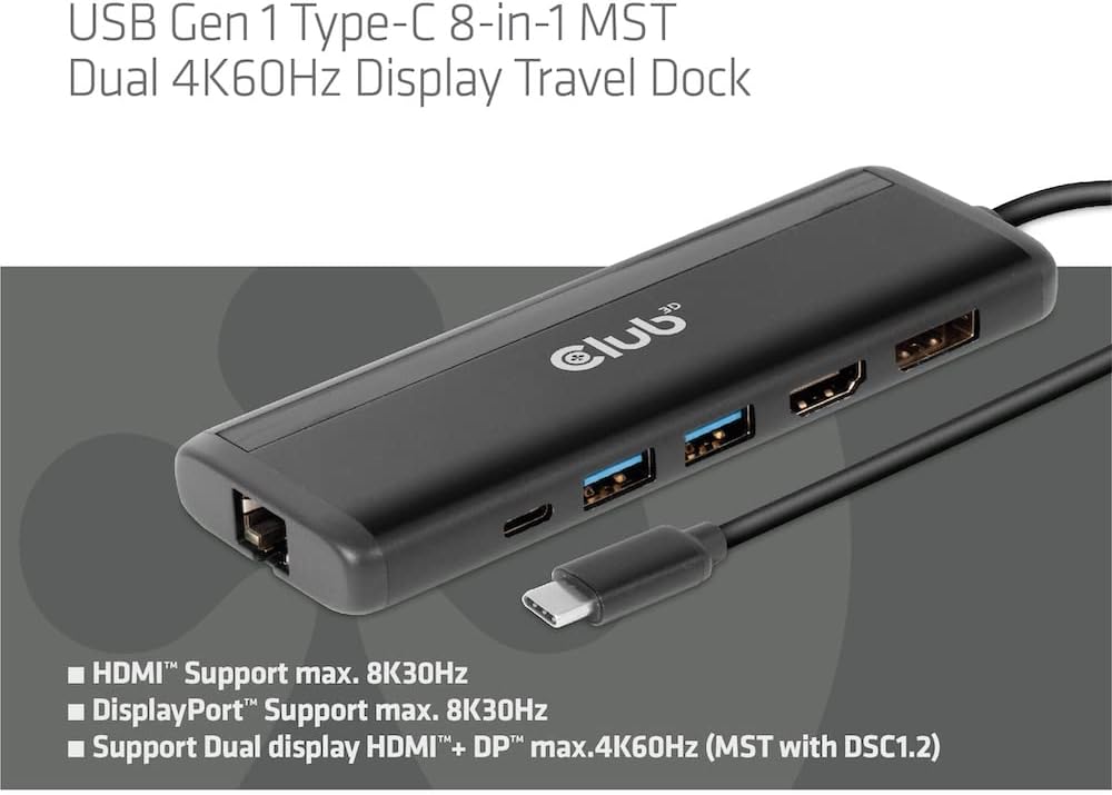 التوافق: يتوافق كابل محطة الشحن Club 3D 8-in-1 Travel USB Type C مع جميع مضيفات USB Gen 1 Type-C التي تدعم وضع DP1.4 Alt ويدعم أنظمة تشغيل Microsoft وApple.