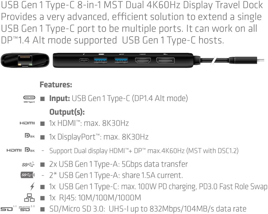شاشة مزدوجة: استمتع بمقاطع الفيديو على شاشة أكبر مع القدرة على توصيل شاشتين في وقت واحد. يدعم محول USB من النوع C متعدد المنافذ HDMI 8K30 هرتز (HDR) وDisplayPort 8K30 هرتز أو شاشة مزدوجة HDMI+ DP بحد أقصى 4K60 هرتز (MST مع DSC1.2)