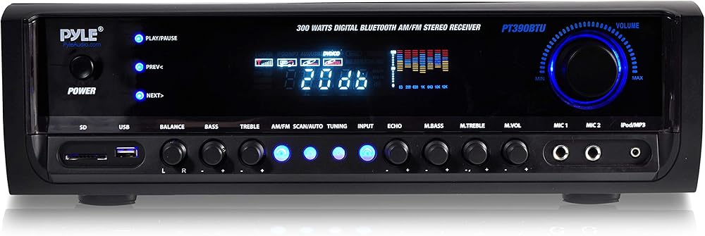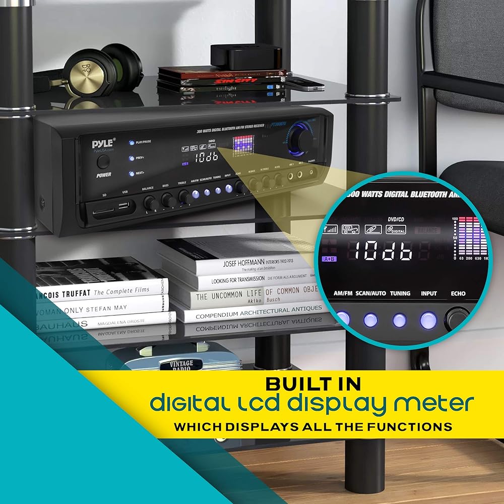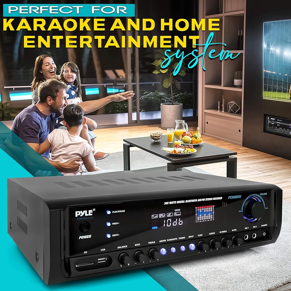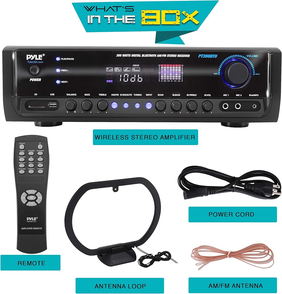 System Features: - 4-Channel Receiver System - Powers Up to 4 Speakers - Bluetooth Wireless Streaming Ability - AM/FM Radio with Digital LCD Display - USB Flash & SD Memory Card Readers - MP3 Digital Audio File Compatibility - Aux (3.5mm) Input Connector Jack - Ability to Connect External Devices - (iPhone, Android, Smartphone, iPad, Tablet, etc.) - (4) Pair Speaker Terminal Binding Posts - (2) 1/4'' Microphone Inputs - (2) Pair RCA (L/R) Audio Input Connector Jacks - (2) Pair RCA (L/R) Audio Output Connector Jacks - Connects to TV, Home Theaters, External Speaker Systems - Radio Station Auto Scan, Tuning Control - Built-in Ventilation Cooling Fan - 50 Radio Station Memory Pre-Sets - Main Volume/Balance/Treble/Bass Controls - Microphone Volume/Bass/Treble/Echo Controls - Includes Antennas, Audio Cable, Remote Control Bluetooth Connectivity: - Instantly Receives Wireless Music Streaming - Works with all of Your Favorite Devices - (iPhone, Android, Smartphone, iPad, Tablet, etc.) - Bluetooth Version: 3.0 What's in the Box: - Home Theater Receiver - Remote Control - AM/FM Antennas - Power Cable Technical Specs: - Power Output: 300 Watt MAX - Impedance: 8 Ohm - T.H.D.: 76dB - Input Lvl. Impedance: 350mV/47k - Tone Characteristics: +/-12dB - Input Sensitivity: 300mV/33k - USB/SD can play what file types: MP3, WMA, WAV - Maximum USB/SD Card support size: 8GB - Frequency Response: 20Hz-20kHz - Battery Operated Remote, Requires (2) x ‘AAA', Not Included - Power Supply: 110/220V Switchable - Dimensions (L x W x H): 16.9'' x 12.2'' x 4.7'' -inches