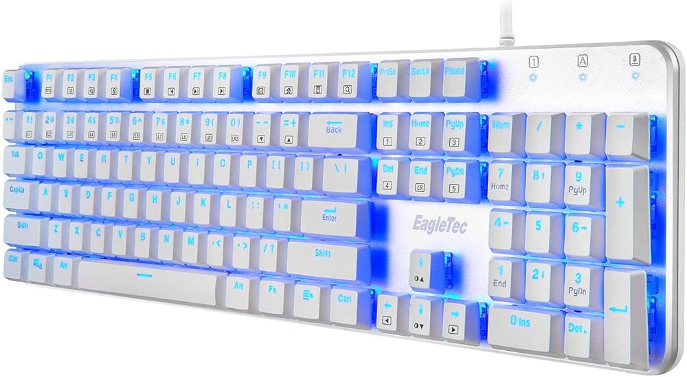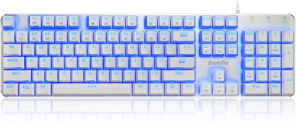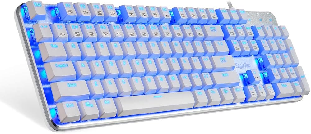 EagleTec KG051-BR لوحة مفاتيح ميكانيكية للألعاب، منخفضة الوضوح، 104 مفتاح بالحجم الكامل مع مفاتيح الكرز MX بنية للكمبيوتر الشخصي (خلفية LED بيضاء زرقاء)