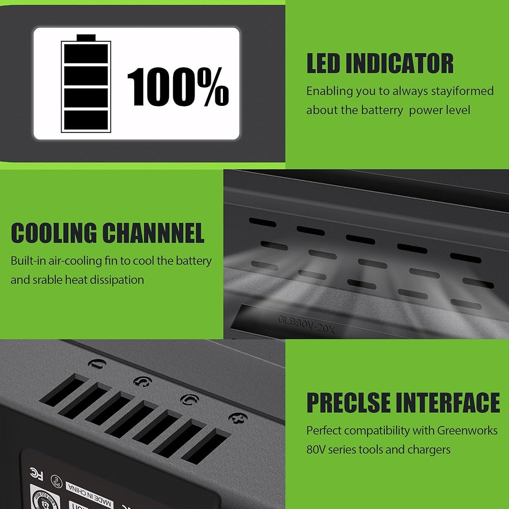متوافقة مع بطارية Greenworks 80v: القراءة الرقمية الموجودة على اللوحة تعرف دائمًا الطاقة المتبقية. جميع المنتجات حاصلة على شهادات FCC وROHS وCE، ومصممة للأجهزة الأصلية، وتم اختبارها مع الشركات المصنعة لـ OME، ومتكيفة بنسبة 100% مع المعدات والشاحن
