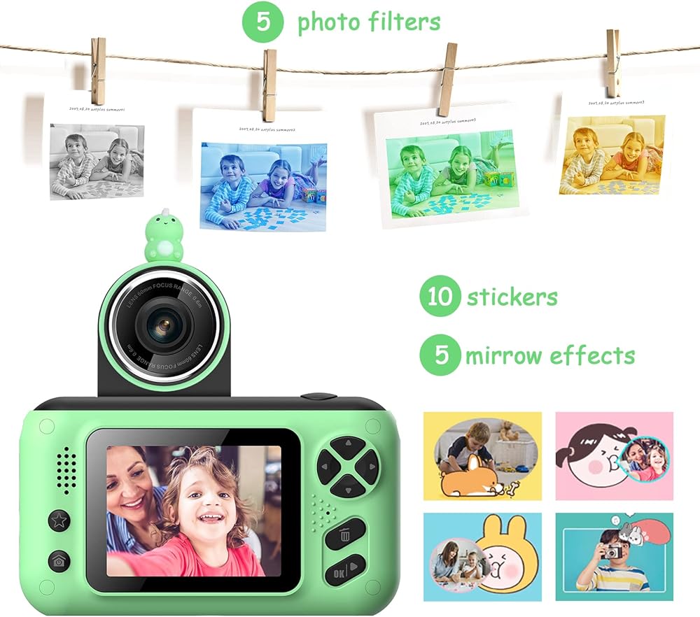 【40 ميجا بيكسل وفيديو عالي الدقة 1080 بيكسل】 تدعم كاميرا الأطفال هذه التصوير الفوتوغرافي بدقة 40 ميجابكسل والفيديو بدقة 1920 × 1080 بيكسل، مما أدى إلى تحسين تعريف الصور ومقاطع الفيديو بشكل كبير. من خلال تصوير ملصق الرأس الكبير، يمكن للأولاد والبنات التقاط صور بإطارات، وترك بعض الصور المضحكة مع العائلة أو الأصدقاء، وتسجيل لحظات الفرح الرائعة!