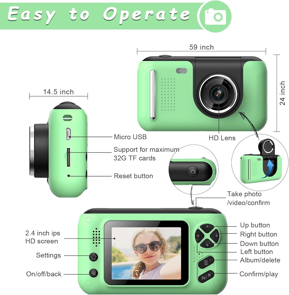كاميرا للأطفال، كاميرا رقمية للأطفال، كاميرات فيديو رقمية عالية الدقة مع كاميرا بعدسة قلابة للأطفال الصغار، هدايا عيد الميلاد للأولاد والبنات، لعبة محمولة للأعمار من 3 إلى 9 سنوات مع بطاقة SD سعة 32 جيجابايت - باللون الأخضر