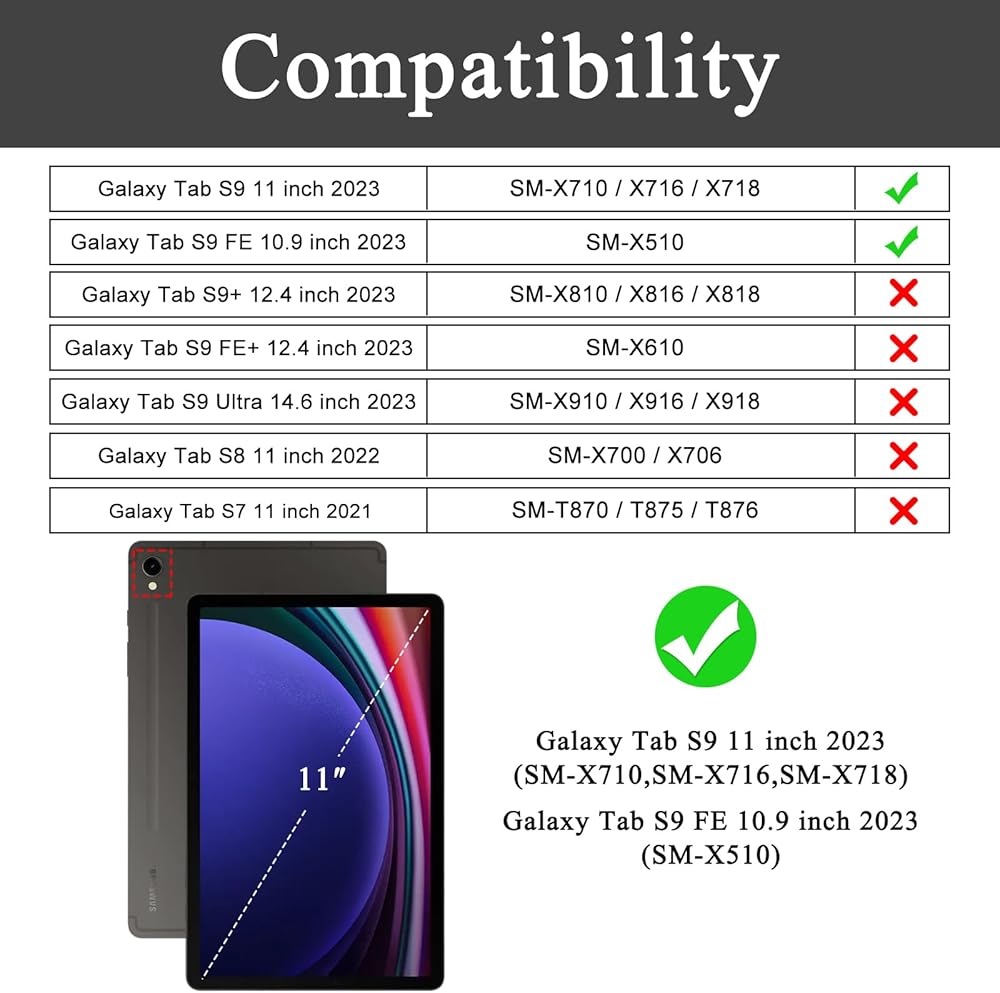 • مصمم لجهاز Galaxy Tab S9 11" وS9 FE 10.9" - مصمم حصريًا لجهاز Samsung Galaxy Tab S9 11" الجديد (SM-X710/X716B/X718U، إصدار 2023) وTab S9 FE 10.9" (SM-X510/X516,2023) مطلق سراحه).