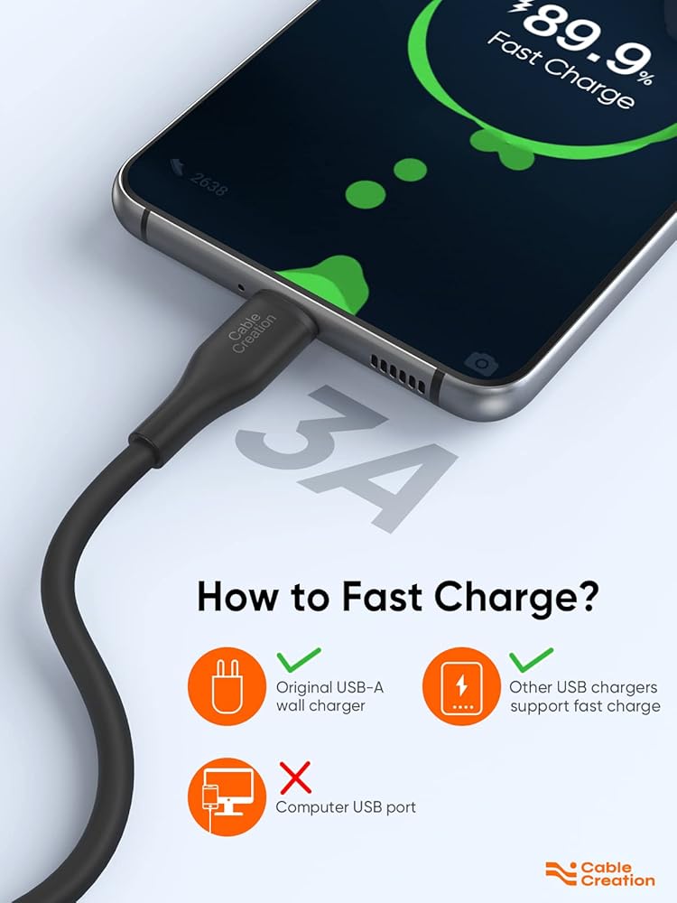 【3A Fast Charge and Sync】CableCreation usb-c to usb cable supports safe high-speed charging up to 5V/3A and fast data transfer max 480Mbps. NOTE: 👉Please use an original USB-A wall charger; 👉Video output is NOT supported; 👉Please this usb type c cord is silicone usb-a to usb-c charging cord