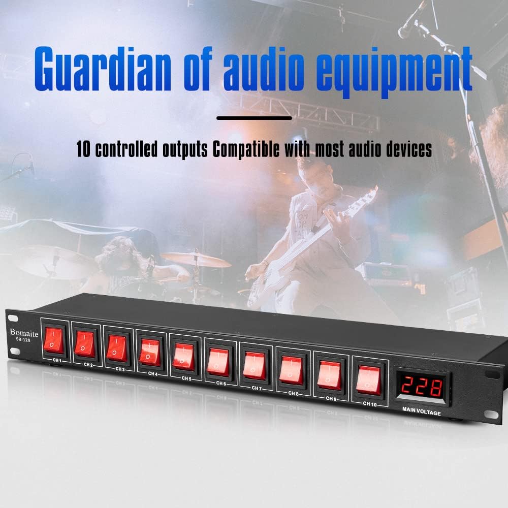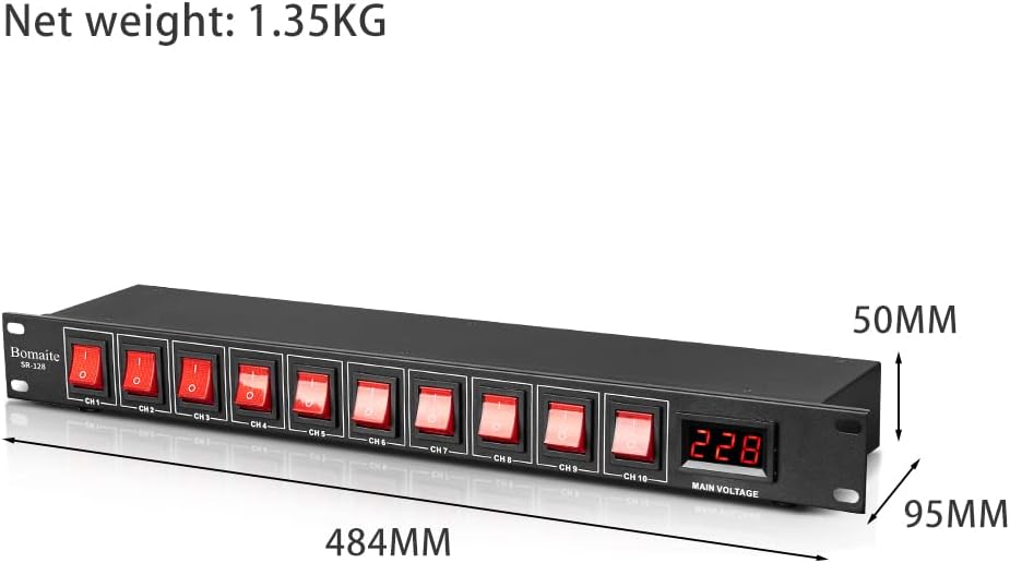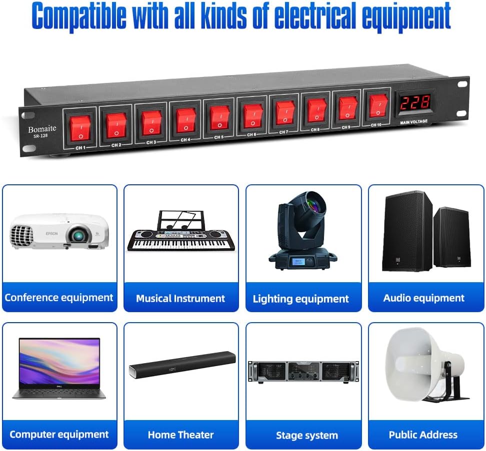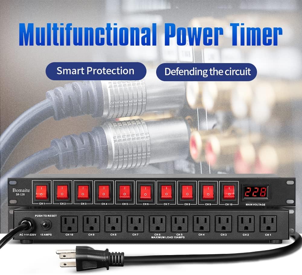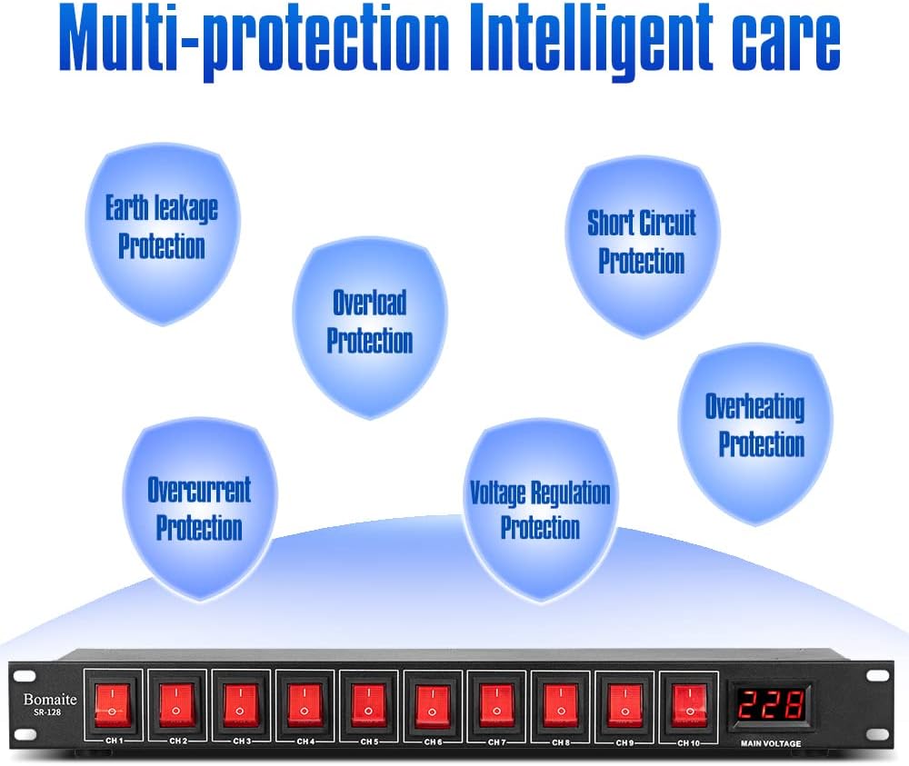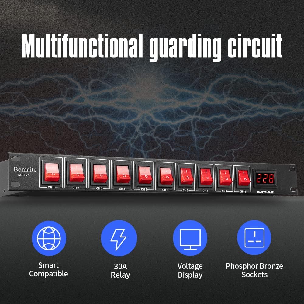 Bomaite SR-128 مكيف تسلسلي للطاقة بـ 10 منافذ - 15 أمبير 1800 واط تيار متردد، مكيف مفتاح تثبيت على حامل الطاقة، جهاز حماية من التيار الكهربائي الرقمي الاحترافي للأجهزة الكهربائية المنزلية، ومكونات الكمبيوتر