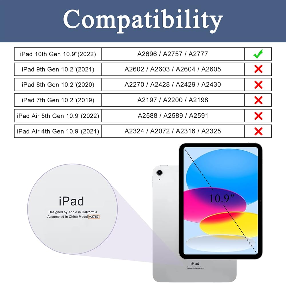 • [مصممة لجهاز ipad الجيل العاشر الجديد 2022] - مصممة حصريًا لجهاز Apple New ipad الجيل العاشر 2022 موديل 2022 فقط (رقم الموديل: A2696/ A2757/ A2777). (نصيحة: لا تتناسب مع الأجهزة الأخرى)