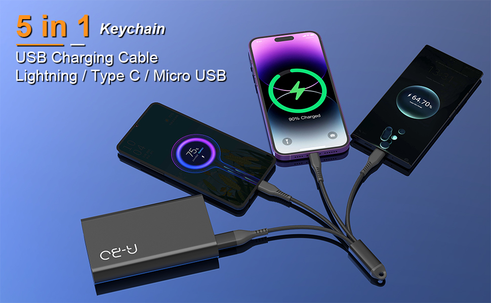 كابل شحن متعدد 5 في 1 - تم تصميم كابل شحن كابل سلسلة المفاتيح 5 في 1 مع كابل شحن متعدد الوظائف 5 في 1، ويحتوي على موصلين إدخال: USB C وUSB A، و3 مخرج مع نوع C /موصلات منفذ USB/Lightning، متوافقة مع iPhone وSamsung وMacbook وHuawei ومكبر الصوت اللاسلكي وبنك الطاقة والمزيد، وتدعم شحن 3 أجهزة في نفس الوقت. الآن أنت بحاجة إلى كابل واحد فقط لجميع أجهزتك!