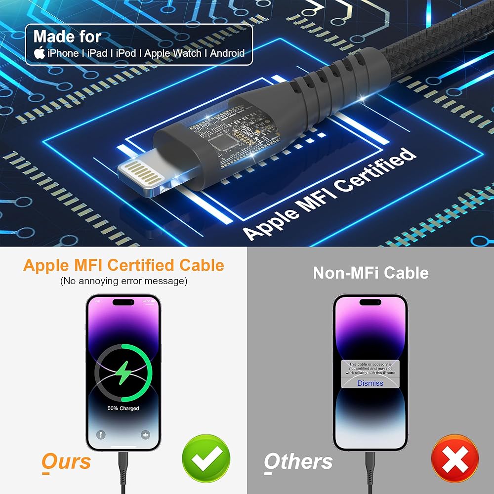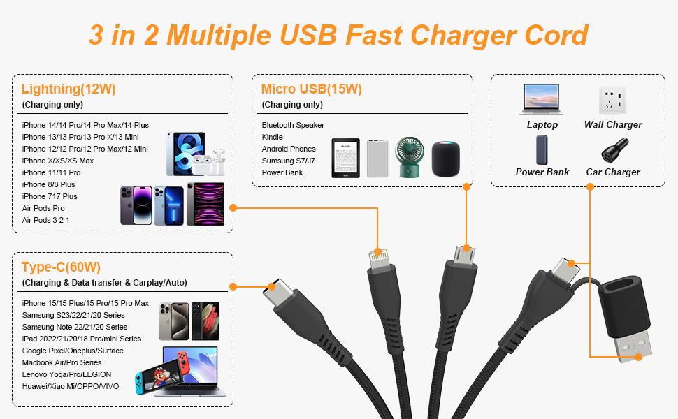 معتمد من MFi وتوافق واسع - كابل MicroUSB/TYPE C/Lightning 3 في 1 من MFi ومعتمد للسلامة، متوافق مع iPhone 15/ 15 Pro/ 15 Pro Max، Samsung Galaxy، Huawei، HTC، LG، Sony Xperia، OPPO/VIVO/ Xiaomi، الهواتف الذكية التي تعمل بنظام Android، iPad، الكمبيوتر اللوحي، الكمبيوتر المحمول، Macbook. iPhone 14/13/12/11/X/ 8/7/6/ 5/Pro/pro Max/ Plus/Mini/SE/Nokia/Galaxy S7/J7/Motorola Moto E4، Kindle/سماعات بلوتوث/تبديل الأجهزة اللوحية/الطاقة البنك / المتحدث