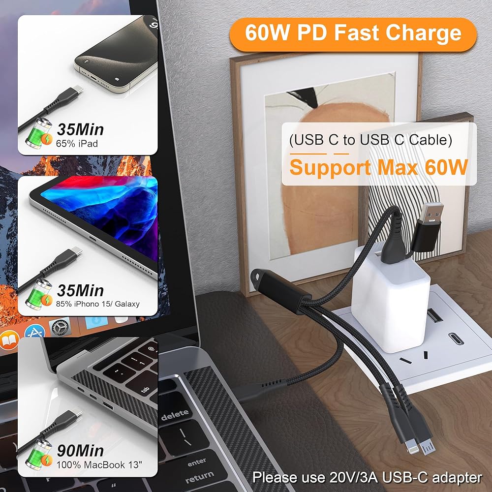شاحن سريع 3A/2.4A ومزامنة البيانات - يدعم كابل USB C القصير هذا الشحن الآمن عالي السرعة (3A) ونقل البيانات بسرعة (480 ميجابت في الثانية). يسمح لك بشحن هاتف Samsung الخاص بك، من 0 إلى 90% خلال ساعة واحدة / iPhone 15، ومن 0 إلى 50% خلال 45 دقيقة. يدعم USB C QC2.0 وQC3.0 وتوصيل الطاقة بقدرة 60 وات والشحن السريع من سامسونج. يلبي كابل الشحن القصير Lightning جميع معايير Apple بسرعات شحن سريعة تصل إلى 2.4 أمبير. يسمح لك بشحن جهاز iPhone 14/13/12 الخاص بك، من 0 إلى 50% في 30 دقيقة أو 75% في ساعة واحدة.