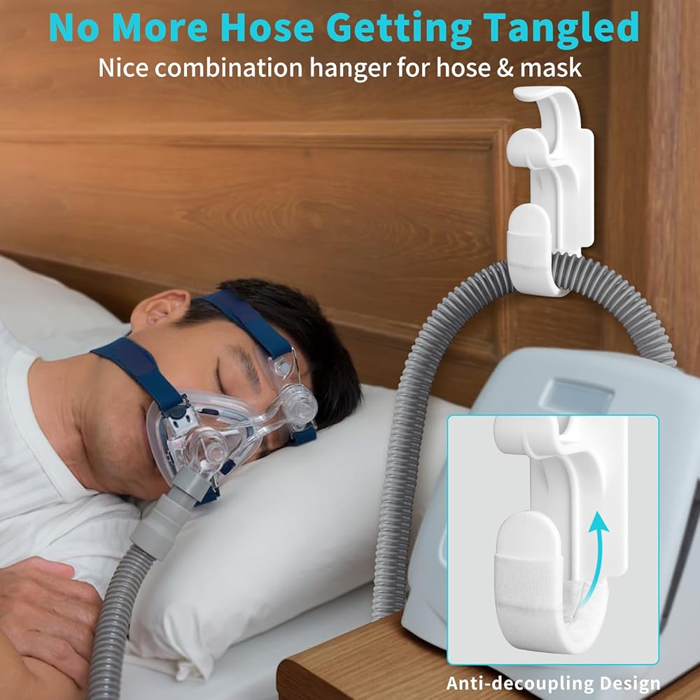 Secure the tubing in place: The cpap hose hanger is specially designed to hold your cpap hose and mask. Features with the anti-decoupling, it can totally keep 3 circles of tubes and mask in place without falling. No more worry about the hose getting tangled around neck.