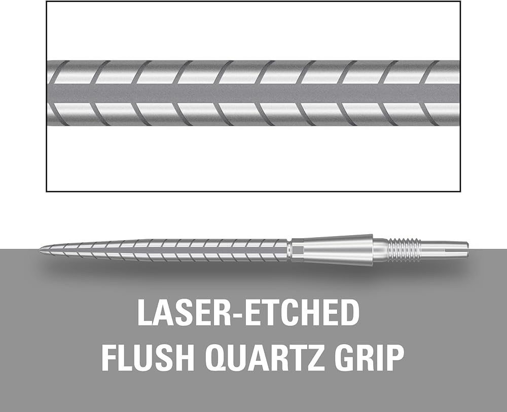 FLUSH FINISHED SWISS STORM POINTS: Designed to sit flush with the barrel for a one-piece dart aesthetic and feel. The Quartz Storm points feature a laser-etched grip to provide added finger grip and secure dartboard entry.