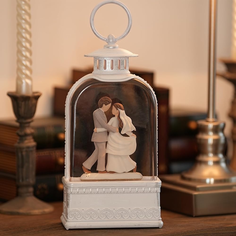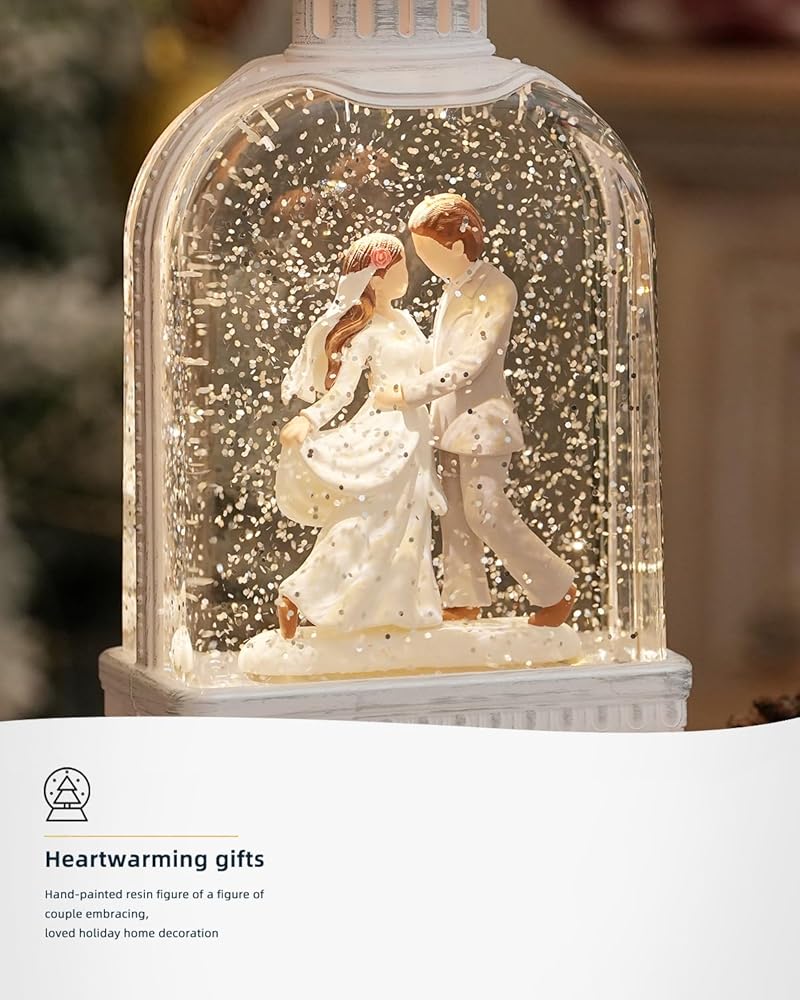كرات ثلج مضاءة بالسعادة: ارتفاع 9.9 بوصة، شكل راتينج مطلي يدويًا لشخصية زوجين يتعانقان. امرأة ترتدي فستانًا أبيض، ورجل يرتدي سترة بيضاء وسروالًا أزرق