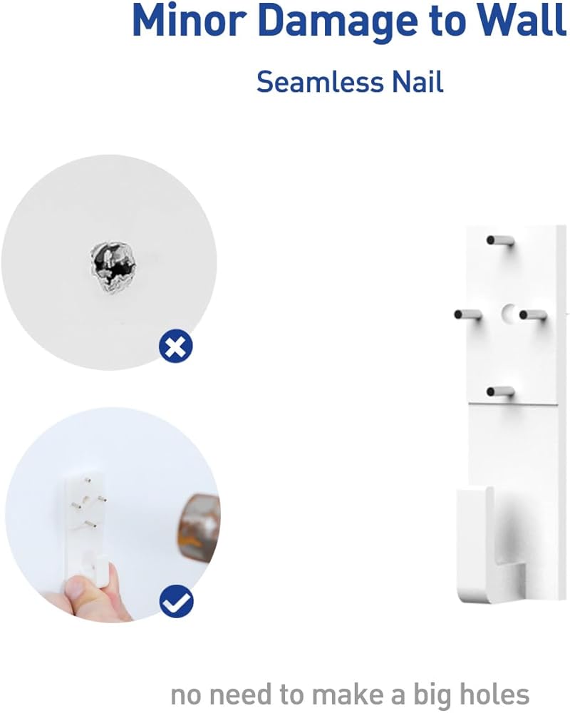 أضرار طفيفة على الجدار. تتوفر طريقتان للتركيب، مسمار بدون خياطة (تلف بسيط على الحائط، لا حاجة لعمل ثقوب) والثقب