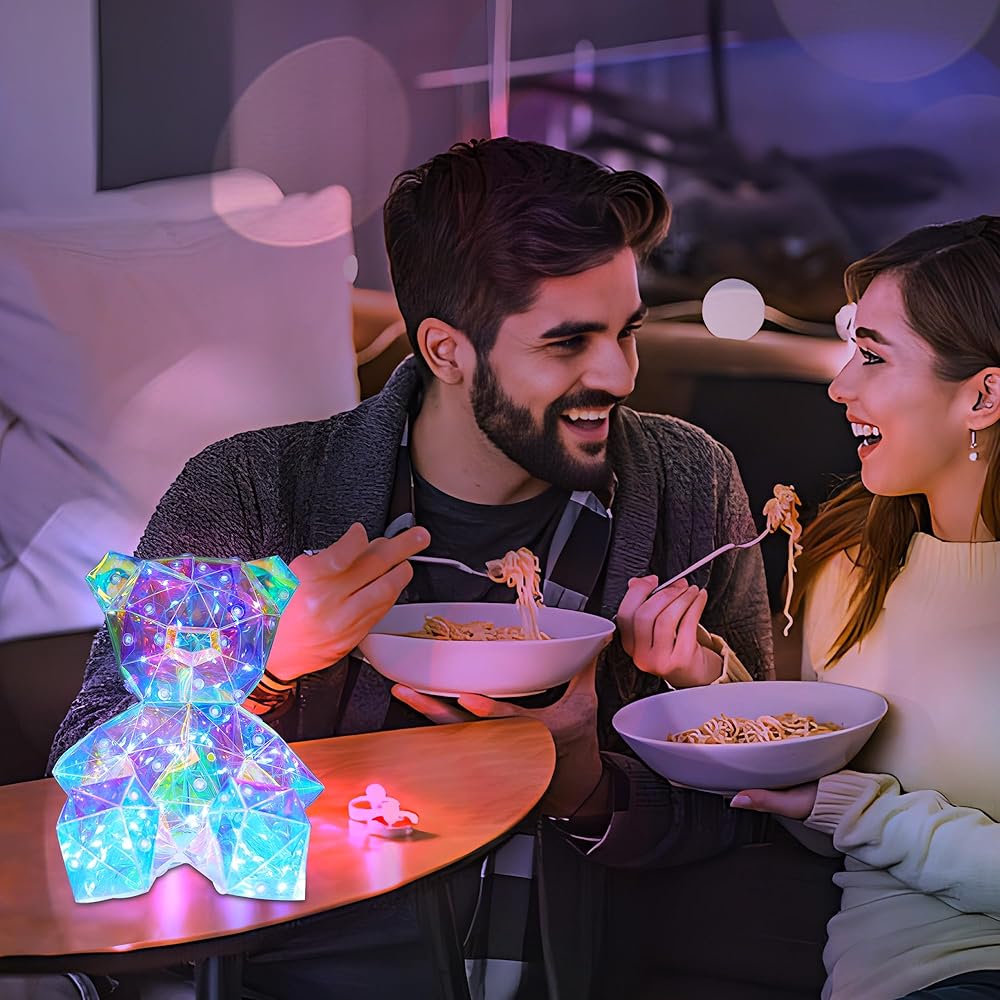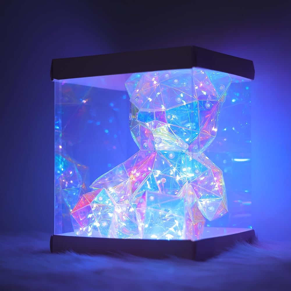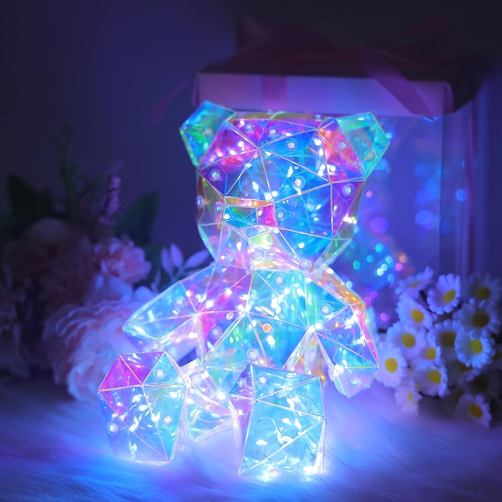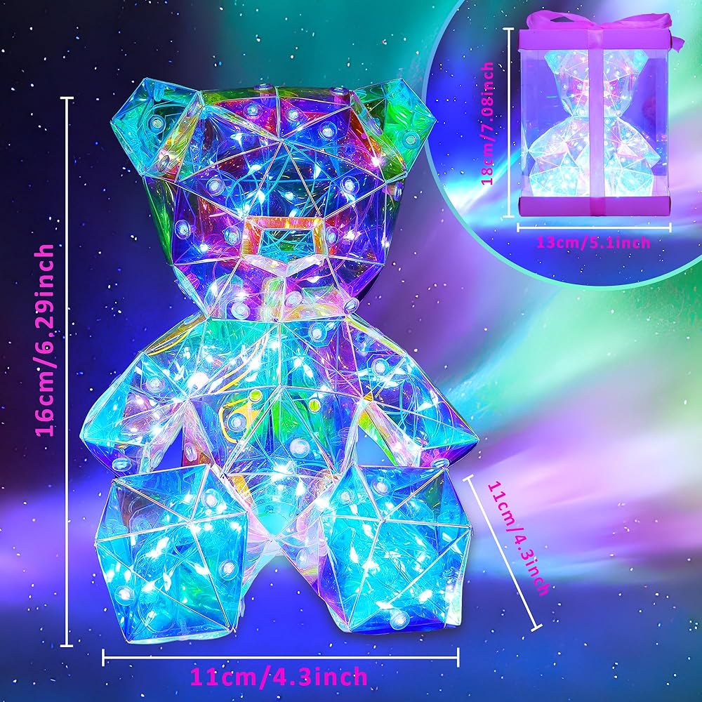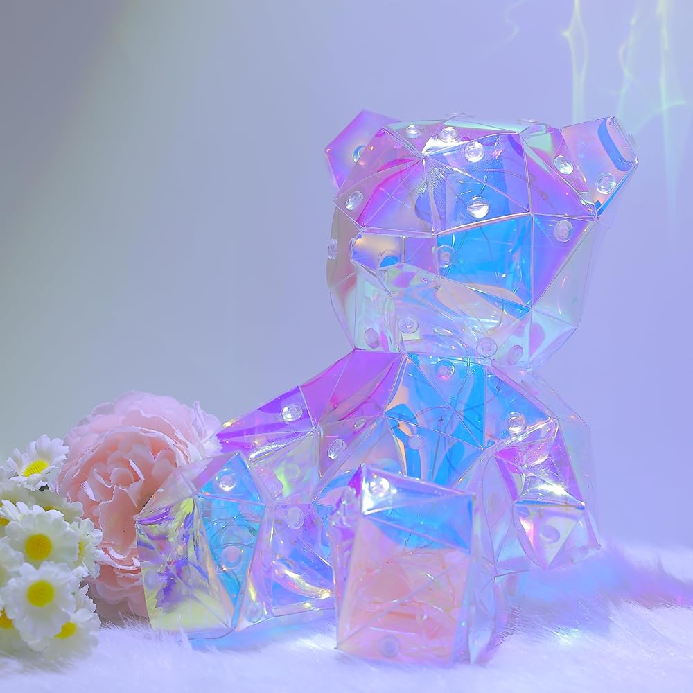 تصميم ثلاثي الأبعاد LED ثلاثي الأبعاد: تم تجهيز دب قوس قزح بشرائط إضاءة LED تعكس الضوء من زوايا مختلفة من خلال تصميمه المضلع، مما يخلق ألوانًا ساحرة تشبه الكريستال وشاشات الضوء! يأتي مع كابل USB (المحول غير متضمن)، مع زر تشغيل/إيقاف موجود في الأسفل، مما يضمن سلامة الأطفال بدون أجزاء صغيرة أو مواد سامة.