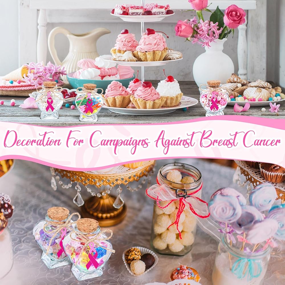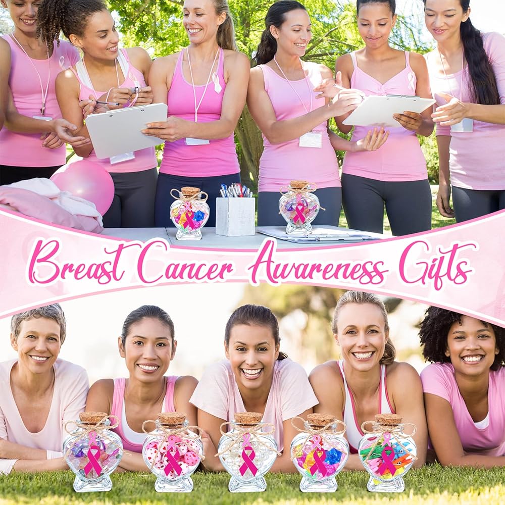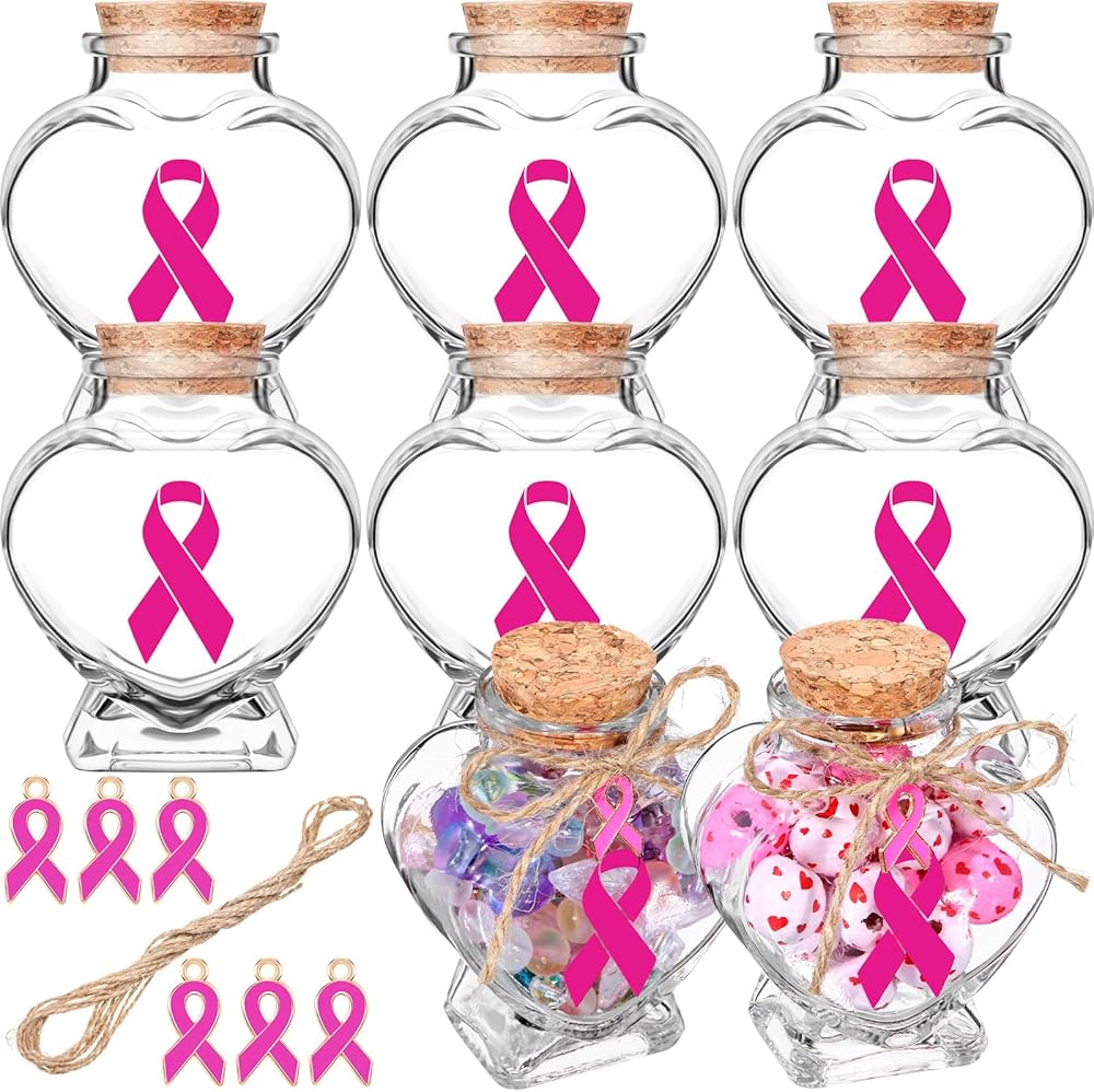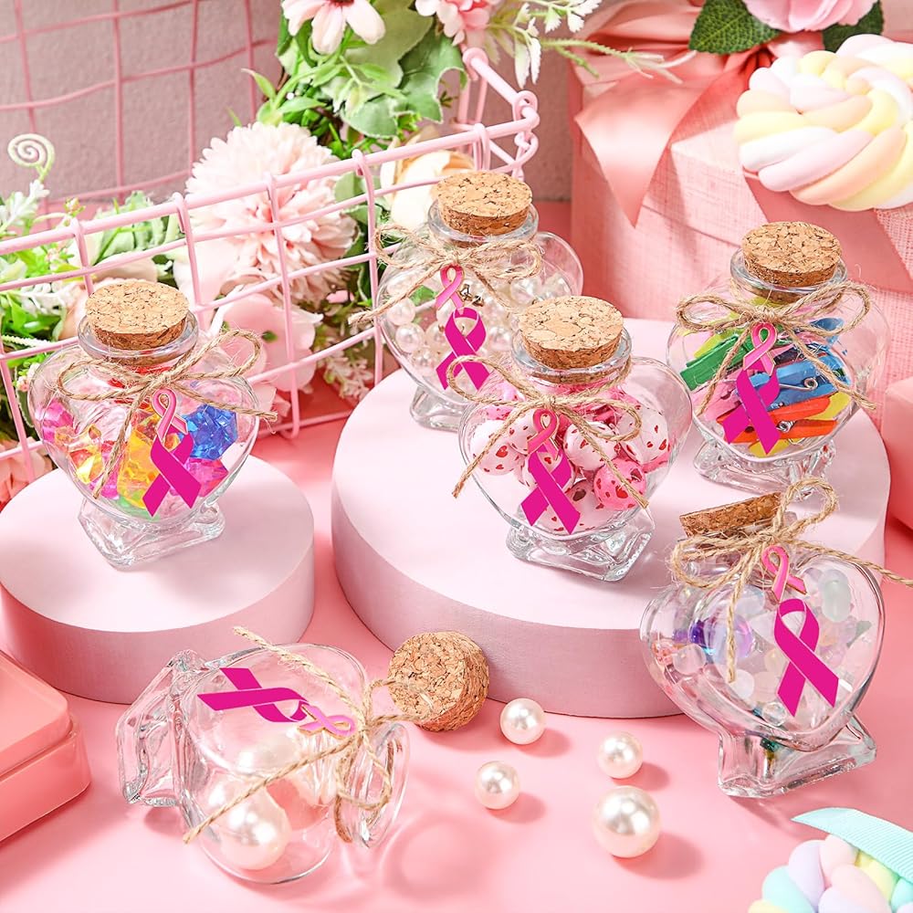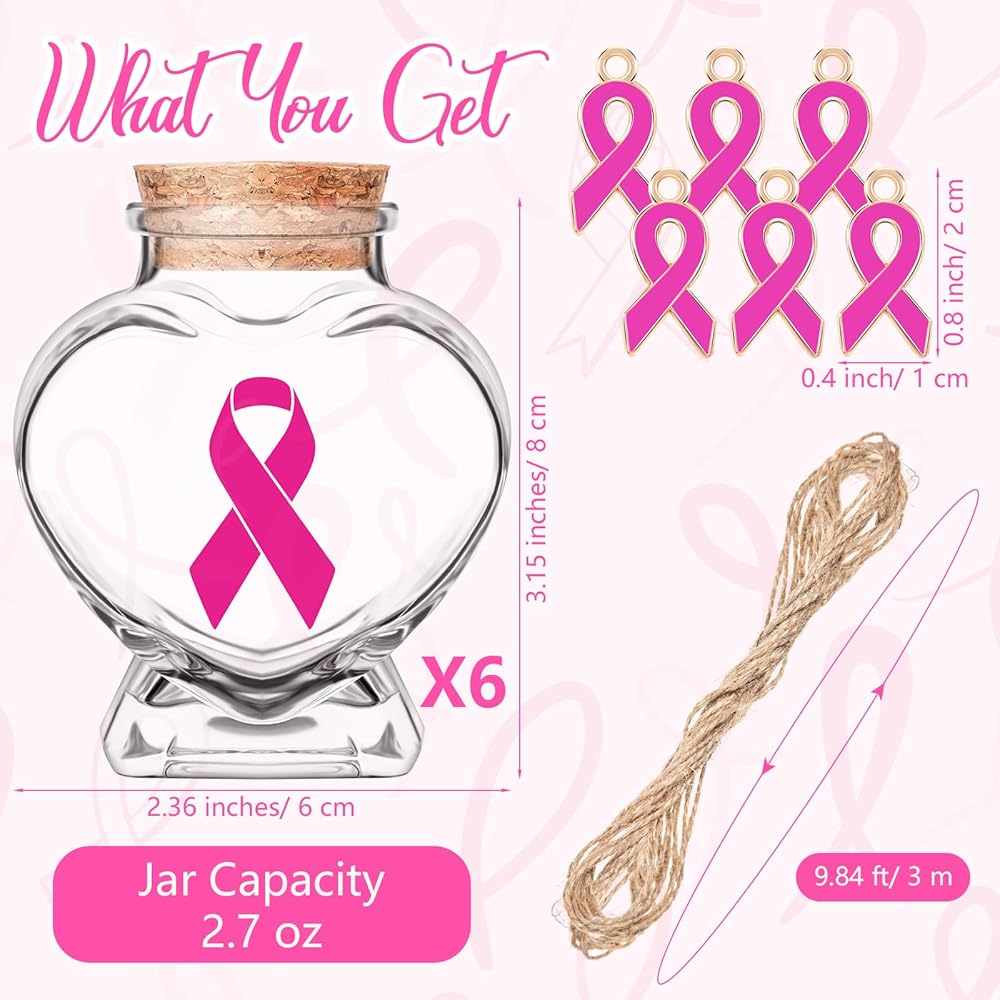 6 عبوات من هدايا التوعية بسرطان الثدي للنساء، برطمانات زجاجية بشريط وردي، زجاجات على شكل قلب مع قلادة بشريط وردي، هدايا ساحرة لسرطان الثدي، برطمانات ذاتية الصنع للنساء هدية شهر الناجيات