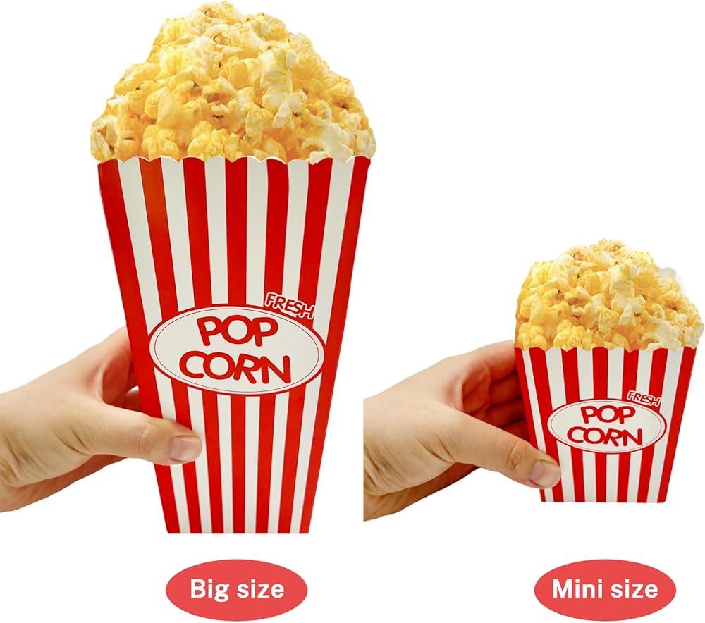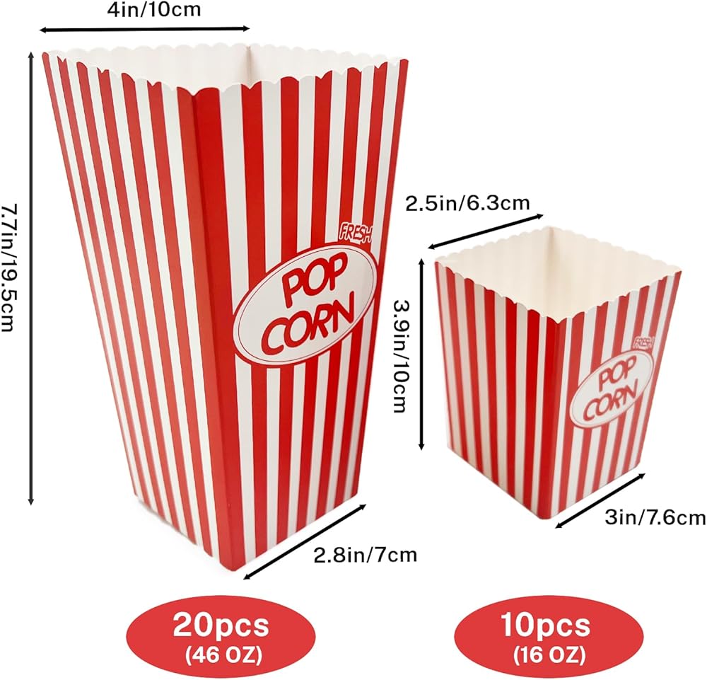 【46oz &16oz Sizes For Different Capacity】You will get 20 pcs large boxes and 10 pcs mini boxes in the package.Large size:7.7"x 4"x 2.8" 46oz, the mini size:3.9"x3"x2.5" 16oz.If you have young children to take care or need to divide food into smaller portions, the mini-size Popcorn Buckets are the great choice to you.