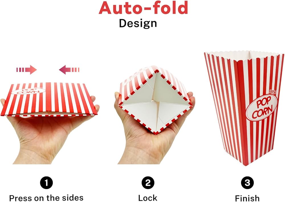 【Easy To Use And Store】You will get Foldable Popcorn Paper Containers so they can be easily stored until you're ready to use them! Due to the convenient-fold design,it's really easy to assemble,y ou just need to push inside the container and pop the bottom of the box out .