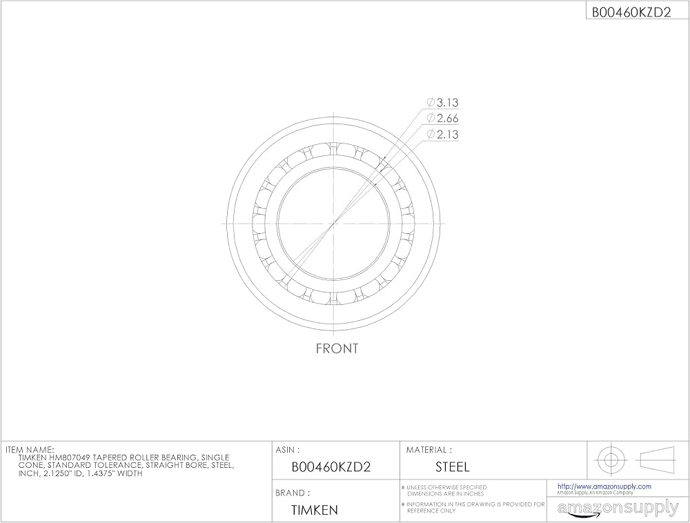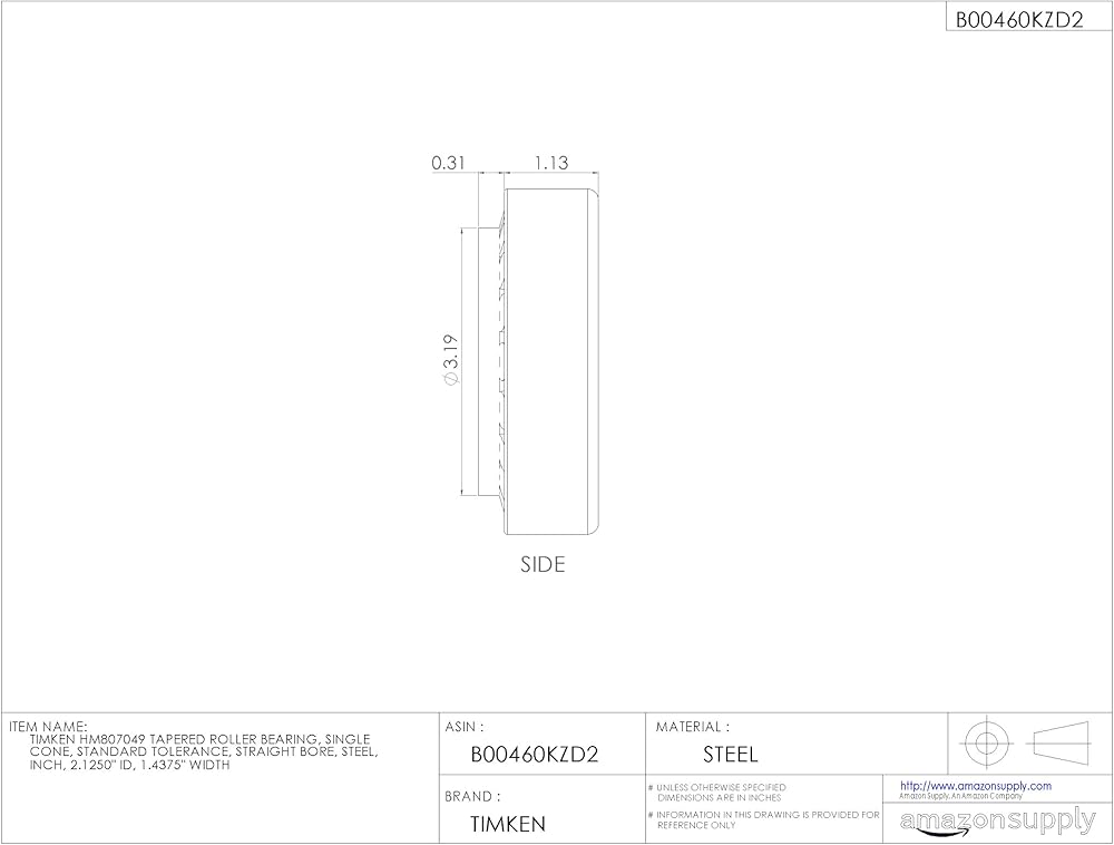 This Timken HM807000 Series single cone with a stamped steel cage matches with a single cup (outer ring, sold separately) to assemble into a complete single tapered roller bearing, suitable for applications that support both radial and axial loads. The cone assembly does not contract or expand under operating temperatures ranging from -54 to 120 degrees C (-65 to 250 degrees F). Generally mounted in opposing pairs on a shaft to evenly distribute loads, this single cone is made of Timken's own high-alloy steel for durability, heat tolerance, and resistance to deformity under heavy loads. The stamped steel cage prevents rollers from coming into contact with each other during use, reducing friction, vibration, and noise. As part of a separable tapered roller bearing unit, this single cone assembly has an open design that allows for lubrication and accurate adjustments. This single tapered roller bearing is for use in high-load, moderate-speed applications that include automotive axle systems and conveyor systems in heavy duty industries such as mining, construction and agriculture, among many other applications.
