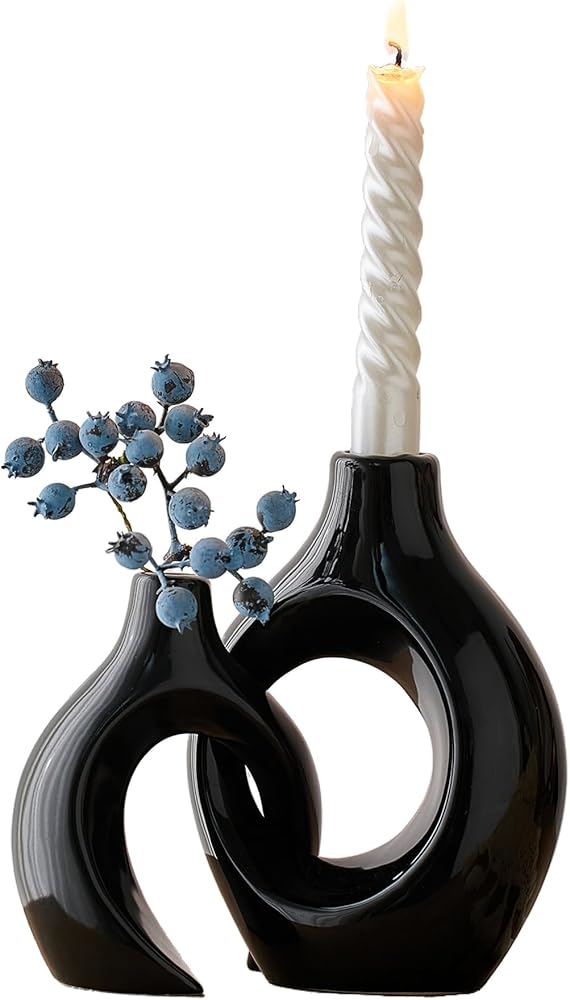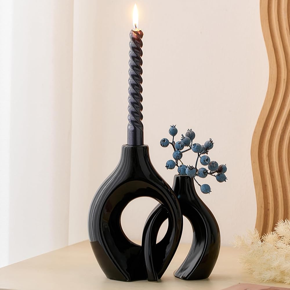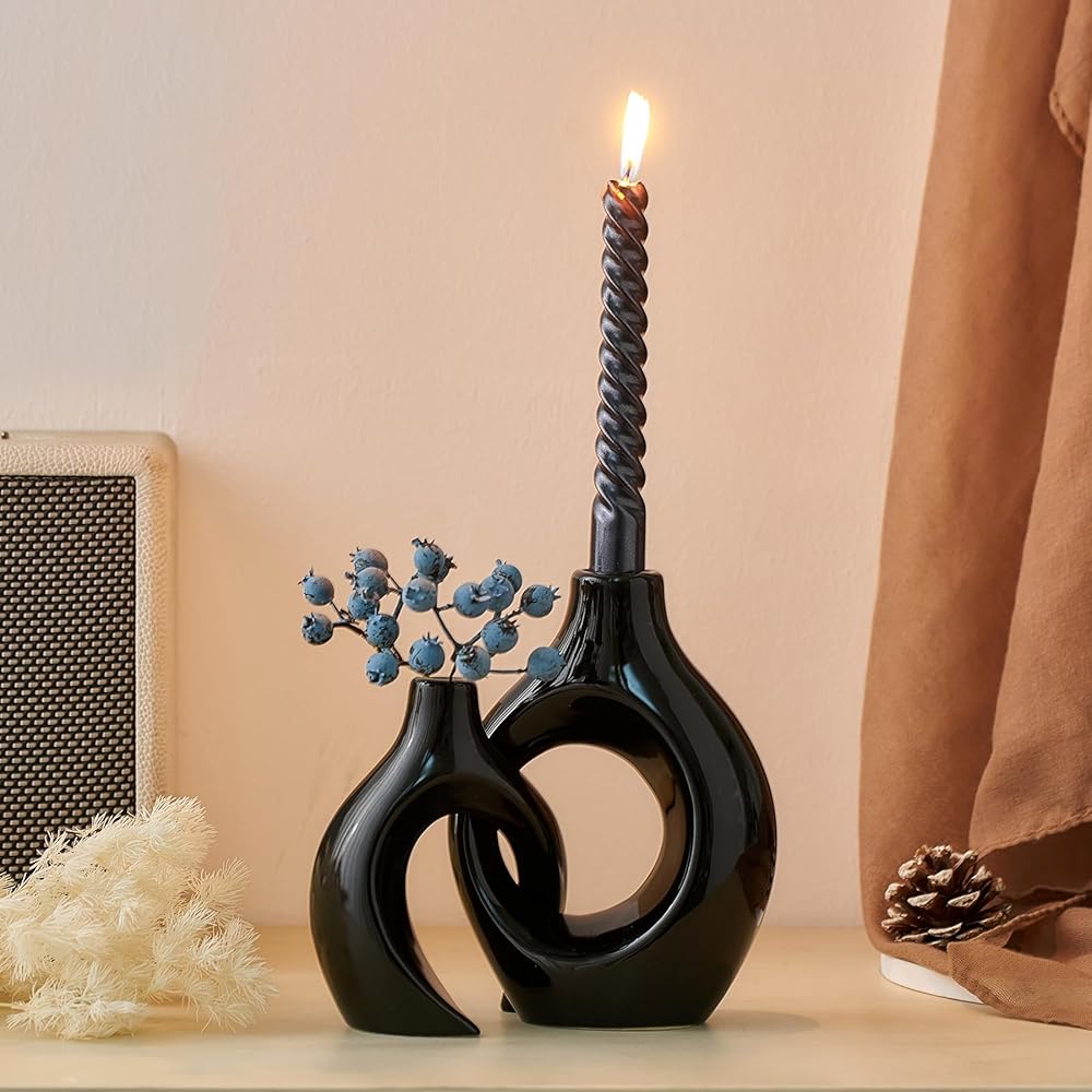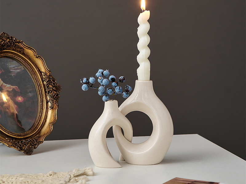 مجموعة شمعدان فريدة من نوعها: تم تصميم مجموعة شمعدان السيراميك المكونة من قطعتين بأشكال مبتكرة يمكن وضعها بشكل عرضي، مما يضيف لمسة من الرومانسية والتفرد إلى أي مساحة، ليس فقط شمعدانًا جميلاً، ولكن أيضًا قطعة فنية رائعة، مثالية للديكور الداخلي الحديث. زينة