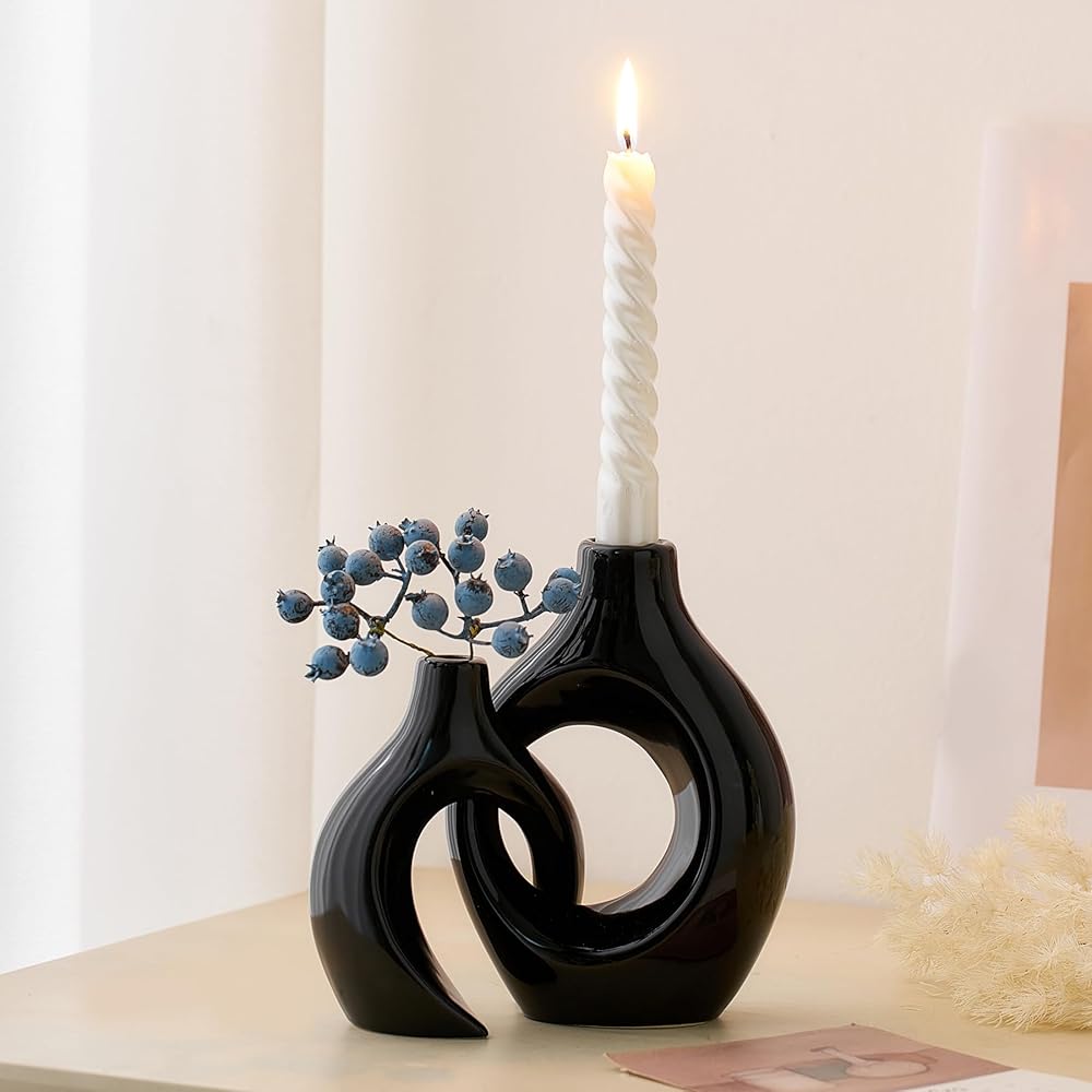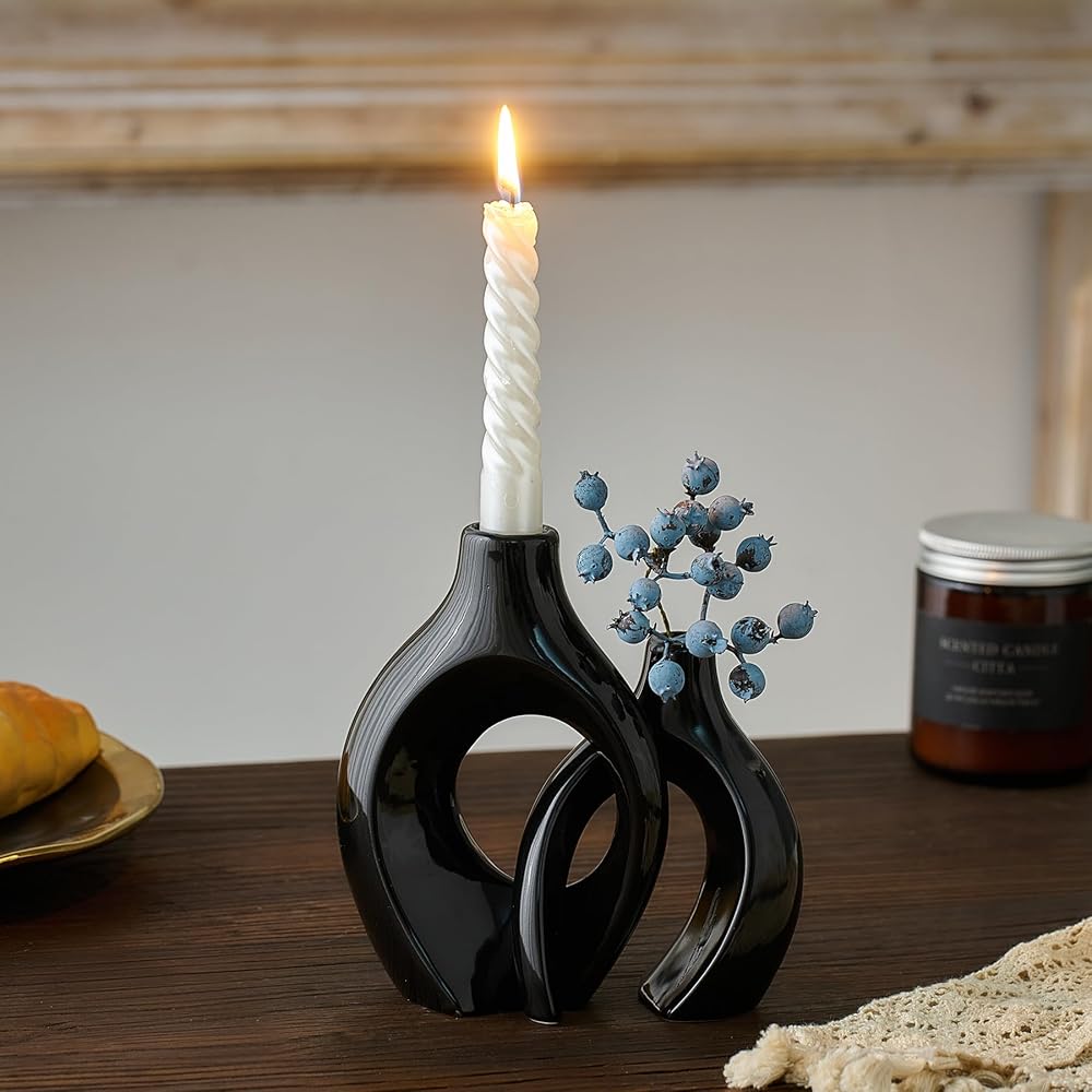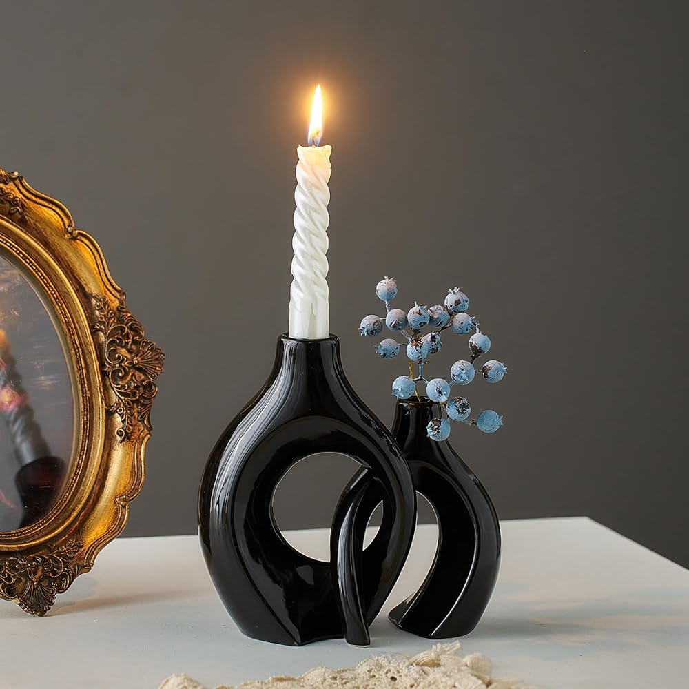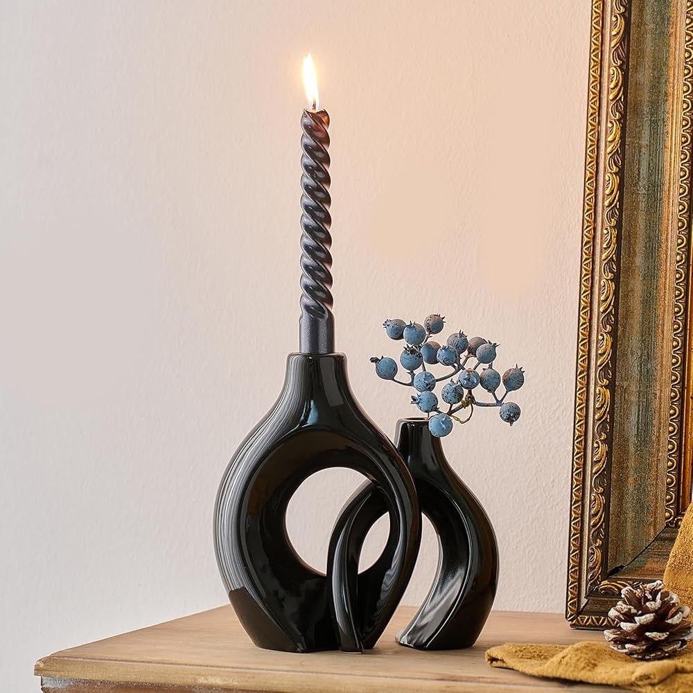 مجموعة شمعدان فريدة من نوعها: تم تصميم مجموعة شمعدان السيراميك المكونة من قطعتين بأشكال مبتكرة يمكن وضعها بشكل عرضي، مما يضيف لمسة من الرومانسية والتفرد إلى أي مساحة، ليس فقط شمعدانًا جميلاً، ولكن أيضًا قطعة فنية رائعة، مثالية للديكور الداخلي الحديث. زينة