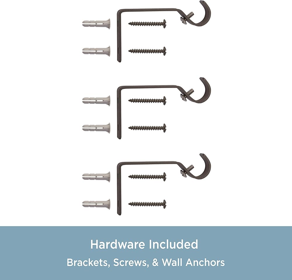 Includes: one telescoping curtain rod with finials, two brackets, one center support, screws, drywall anchors, and installation instructions