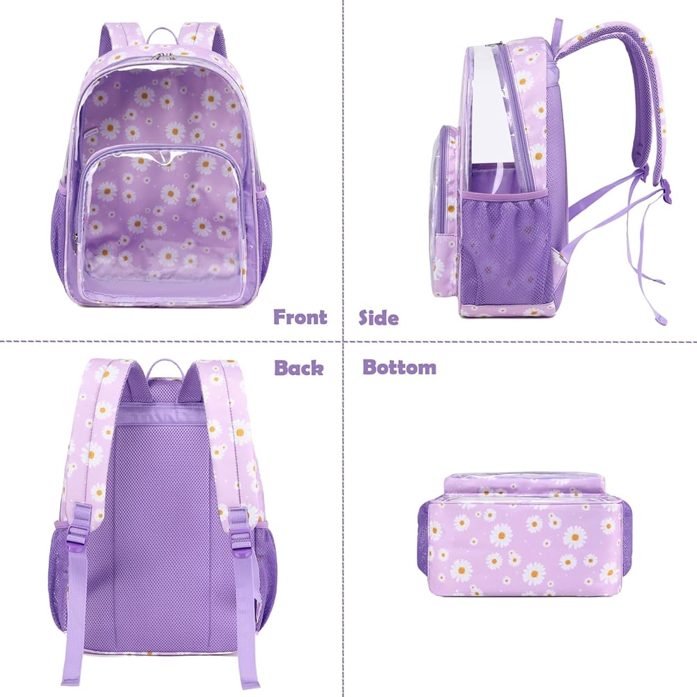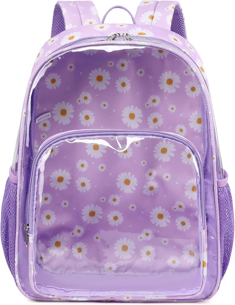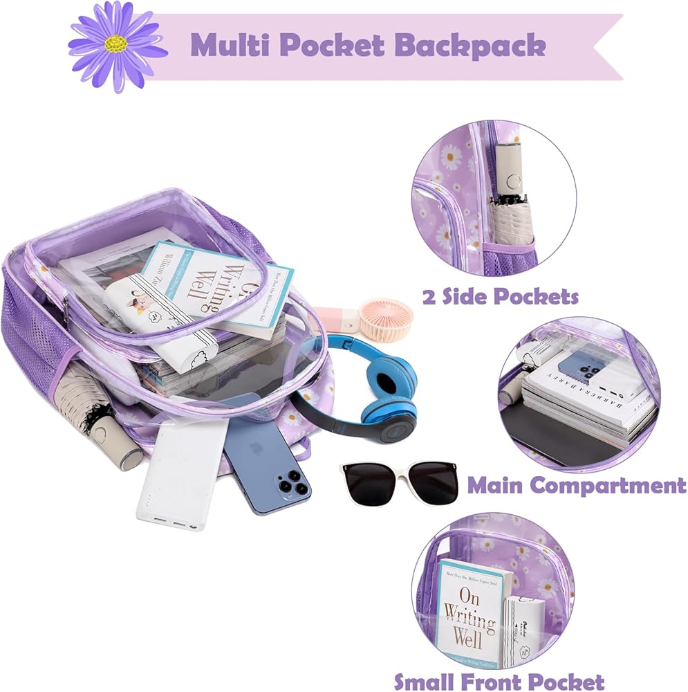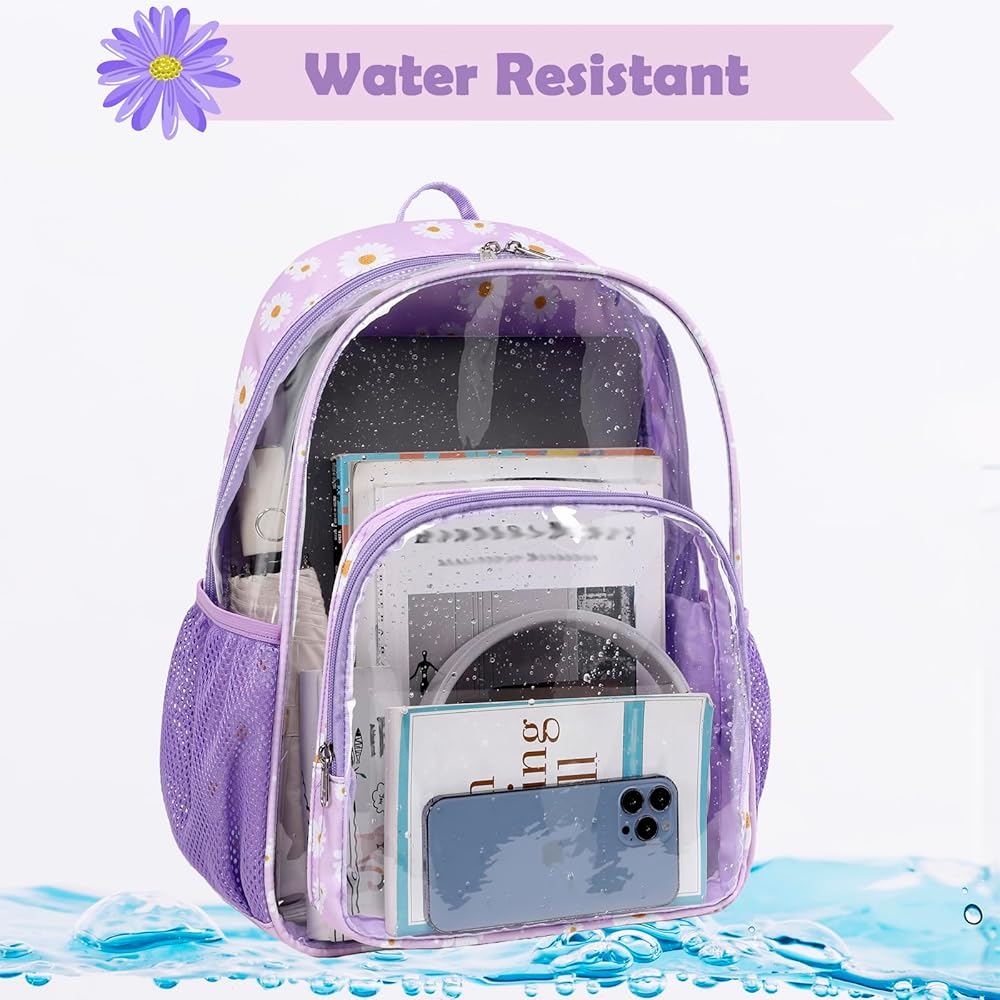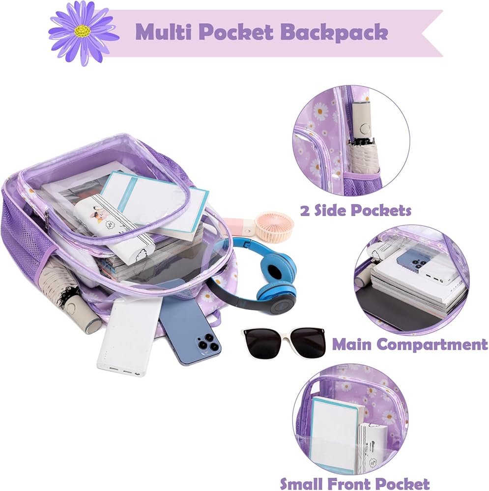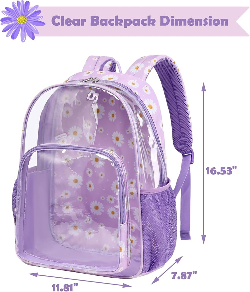 【حقيبة ظهر شفافة ذات سعة كبيرة】يبلغ حجم الحقيبة المدرسية الشفافة 11.8 × 7.9 × 16.5 بوصة، وتحتوي على مساحة رئيسية كبيرة للملابس ودفاتر الملاحظات والكتب المدرسية والمجلدات واللوازم المدرسية، وما إلى ذلك، وجيب أمامي آمن بسحاب للهواتف المحمولة الأشياء الثمينة الأخرى. بالإضافة إلى ذلك، تحتوي حقيبة الظهر البلاستيكية الشفافة على جيبين شبكيين جانبيين للأكواب والمظلات.