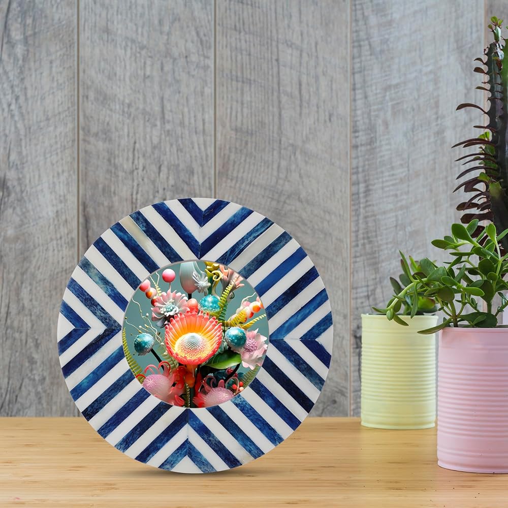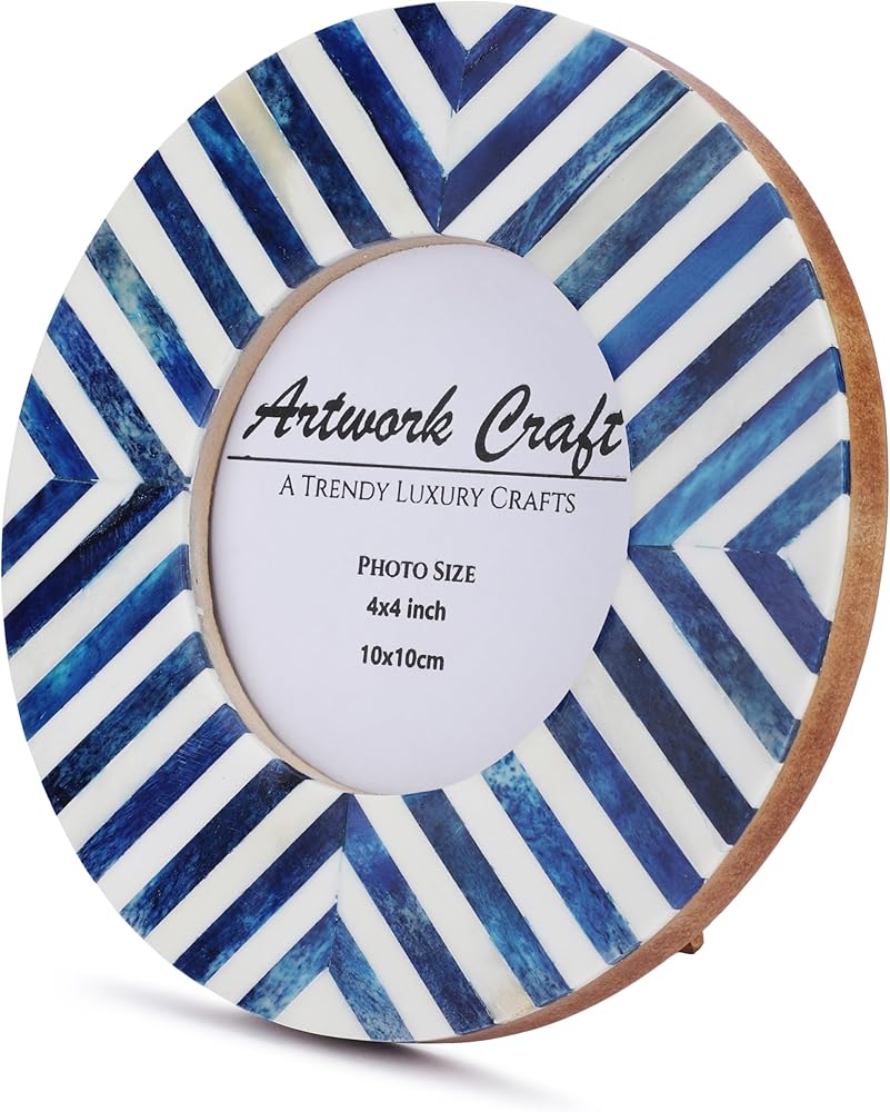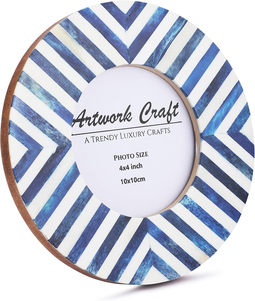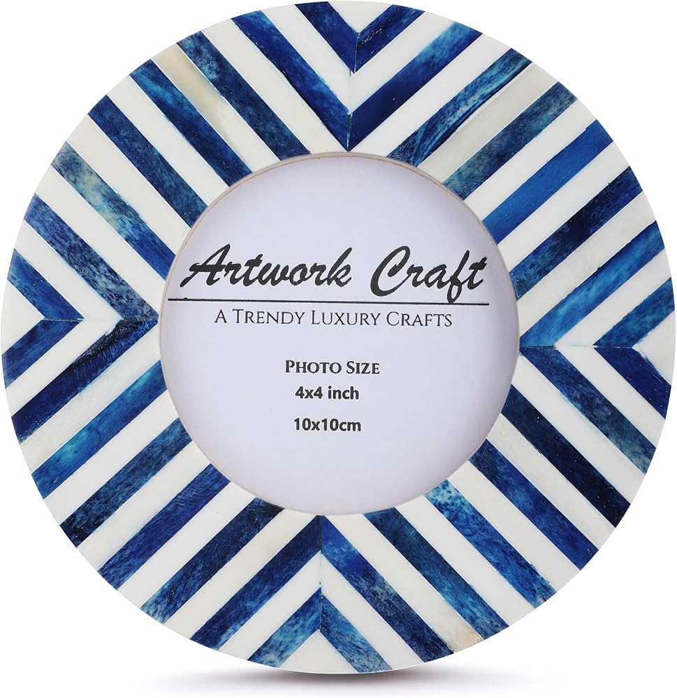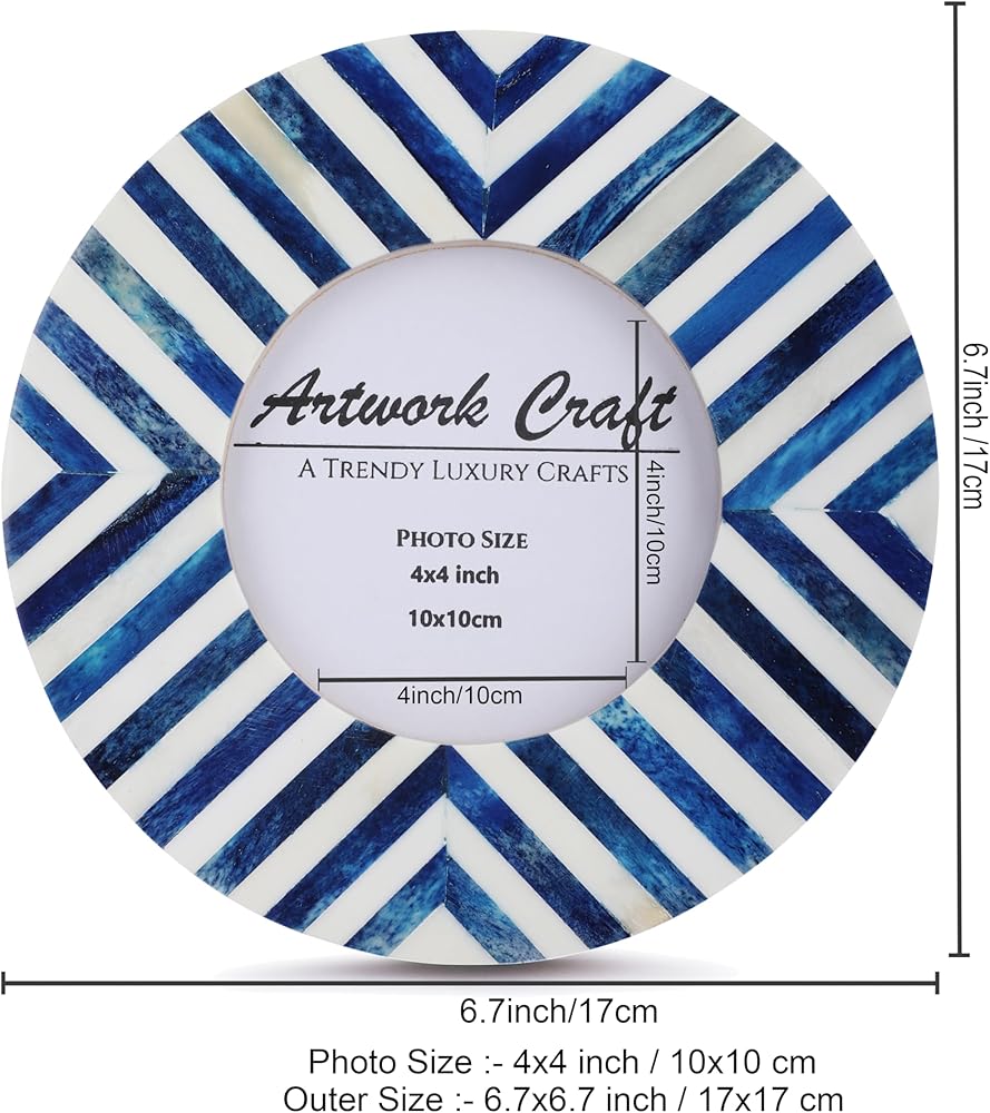 Photo Frames not only Protect Your Memories and Artwork but also Make a Statement on your Side Tables And Walls. This Exclusively Curated Round Chevron Herringbone Art Gray White Picture Frame is Available in two Color Blue and Gray. You can order both Color for Desktop Display and Wall Mounting Indoor Decor. IT's Handmade : Artwork Craft 4x4 Handmade Round Bone Photo Frame has been Meticulously Inlaid Piece by Piece by Artisans on pine wood Frame and Border Width is 1.5 inch and Backing Wherein the Pine Wood MDF is provided With Tie. and we Use High quality Glass you can see your Photos or Pictures Extremely Clearly and all Artwork Craft Frames Comes with Saw Tooth Hangers On the Back You can also Hang Them On Wall. These Decorative Picture Frame Make a Great Gift for Weddings, Birthday parties, Housewarming Parties, and all Sorts of Occasions. Its Build, Quality, and Design are Extremely Pleasing to the Eye - Everyone will Surely Love to Have one. HANDMADE PRODUCT DISCLAIMER- Please Note That all our Home Décor Products are Meticulously Handmade, Please keep Away From Direct Sun-light or Strong Halogen Lights. The Product May be Cleaned With a Soft Dry Cloth.