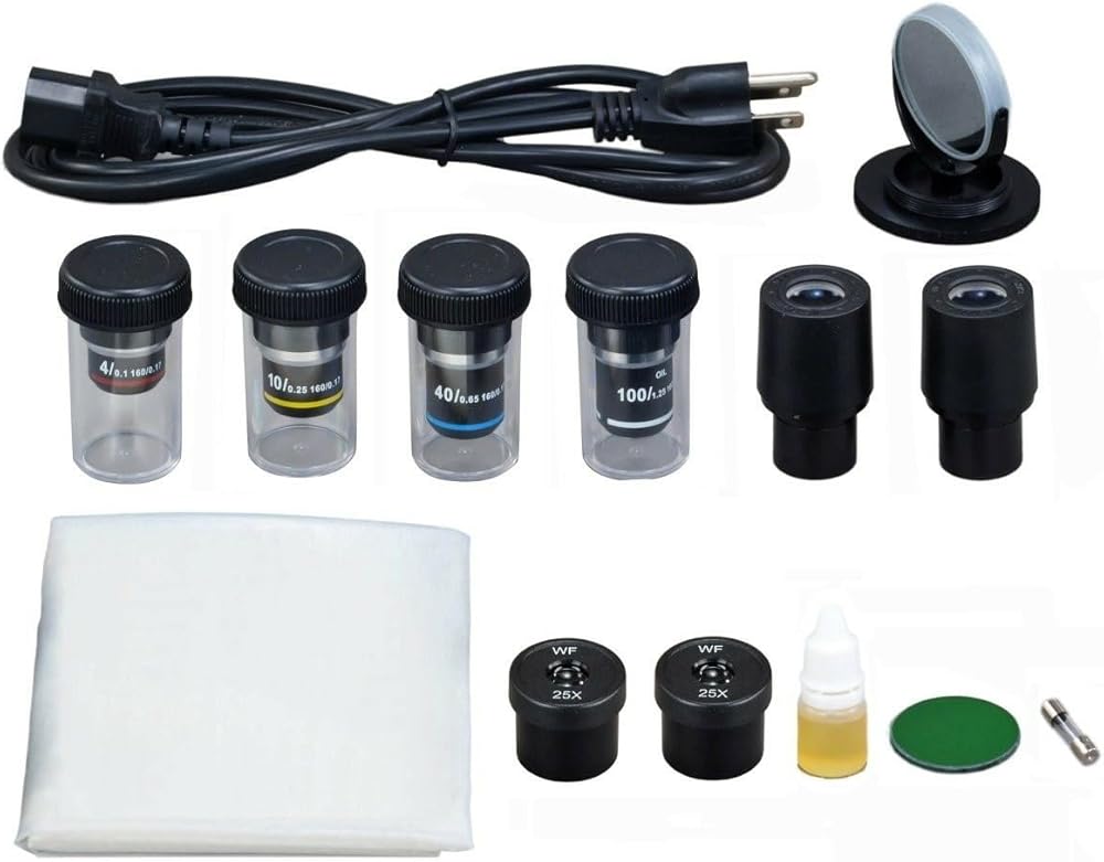 Total magnification: 40X-100X-250X-400X-1000X-2500X; Eyepieces: widefield WF10X/18 and WF25X; Objectives: achromatic DIN 4X, 10X, 40X (S), 100X (S, Oil); Viewing head: 45 degrees inclined 360 degrees swiveling trinocular; Interpupillary distance: sliding adjustable 2-3/16inch ~ 2-15/16inch (55mm ~ 75mm); Diopter: adjustable on both eyepiece tubes; Nosepiece: revolving quadruple