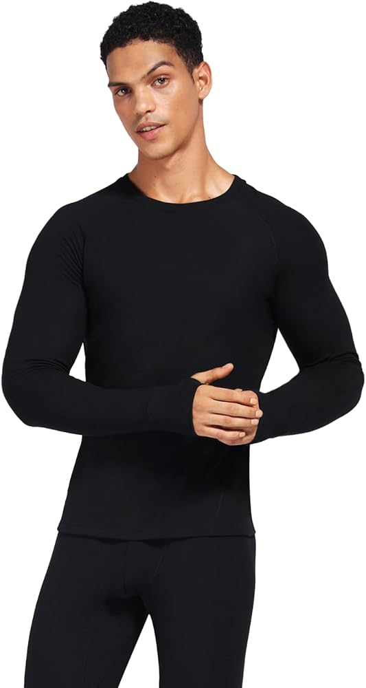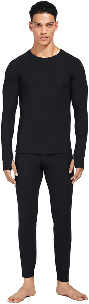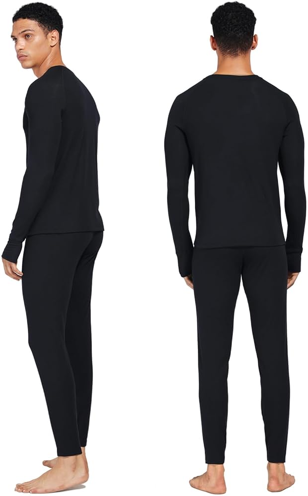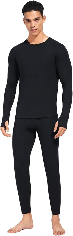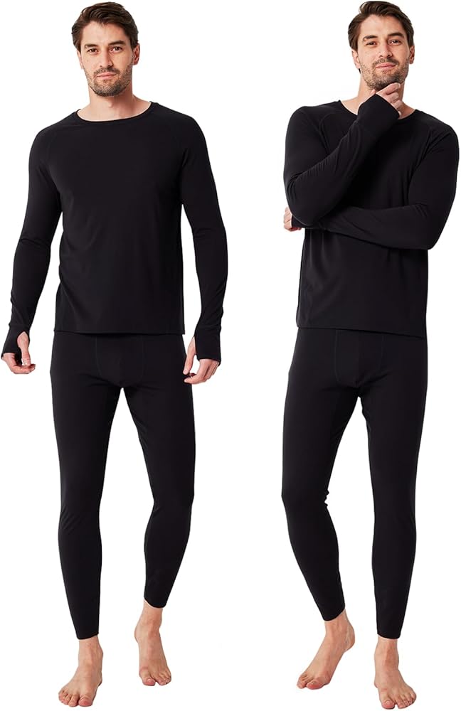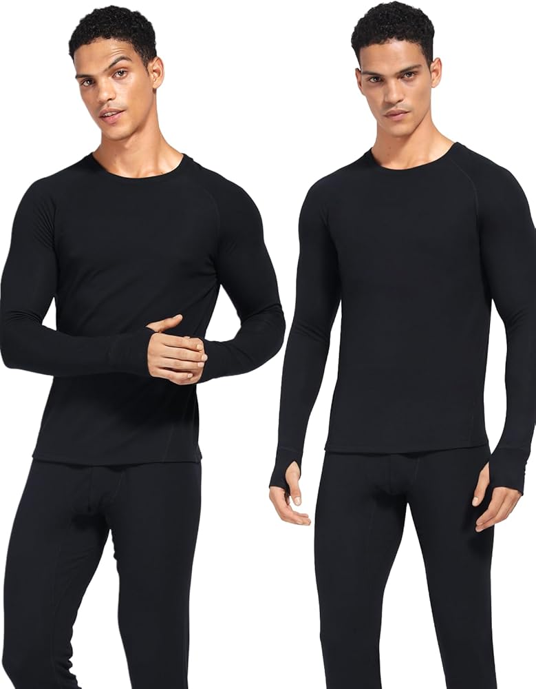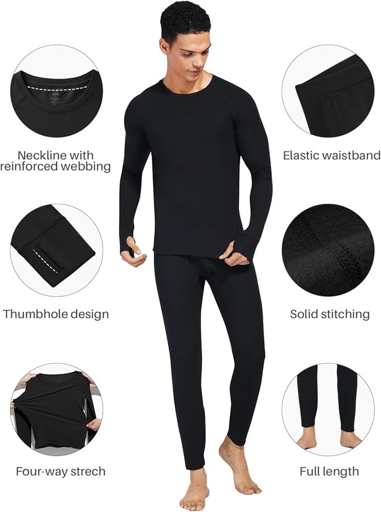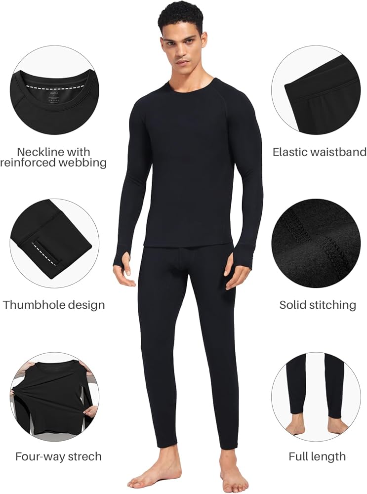 مجموعة الملابس الداخلية الطويلة للرجال مع فتحات إبهام في الأساور تمنع الهواء البارد من الهروب من خلال الأساور، كما تساعد على الحفاظ على الأكمام في مكانها، مما يجعلها مثالية للأنشطة الشتوية الخارجية مثل التزلج والمشي لمسافات طويلة وكطبقة أساسية أو طقم بيجامة في الشتاء البارد