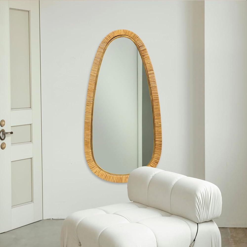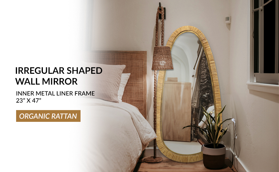 Mirrorize 24x48 Tulum غير النظامية الروطان مرآة اليدوية إطار بيضاوي مرآة الحائط، البيج ديكور بوهو لهجة الحمام الشاطئ مرآة