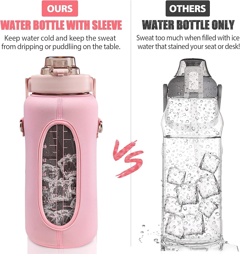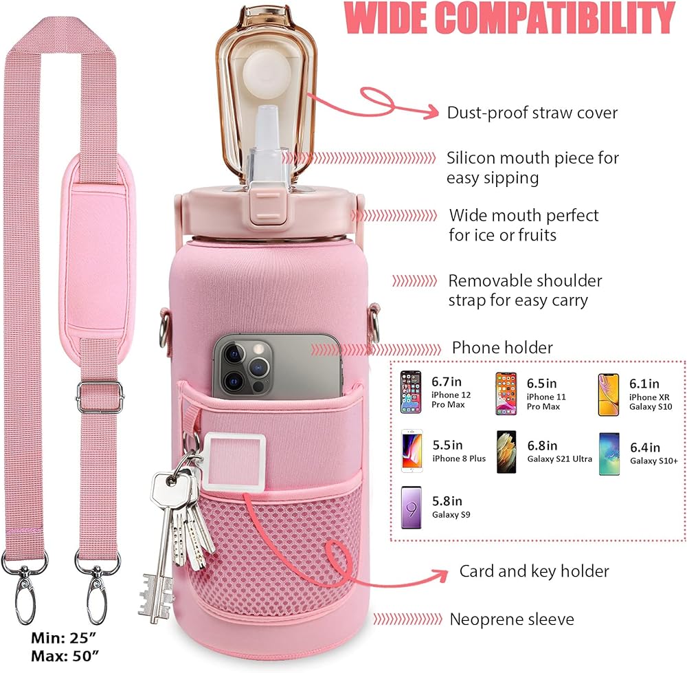 💕 Half-Gallon Water Bottle: 64 oz. straw water bottle with sleeve, one-touch button on the lid for quick drinking, measuring scale on the bottle, and a translucent look so you can see the water level at a glance. A timeline and motivational message will remind you to keep drinking water every day! The water bottle sleeve is designed to hold your phone, wallet, cards and more!