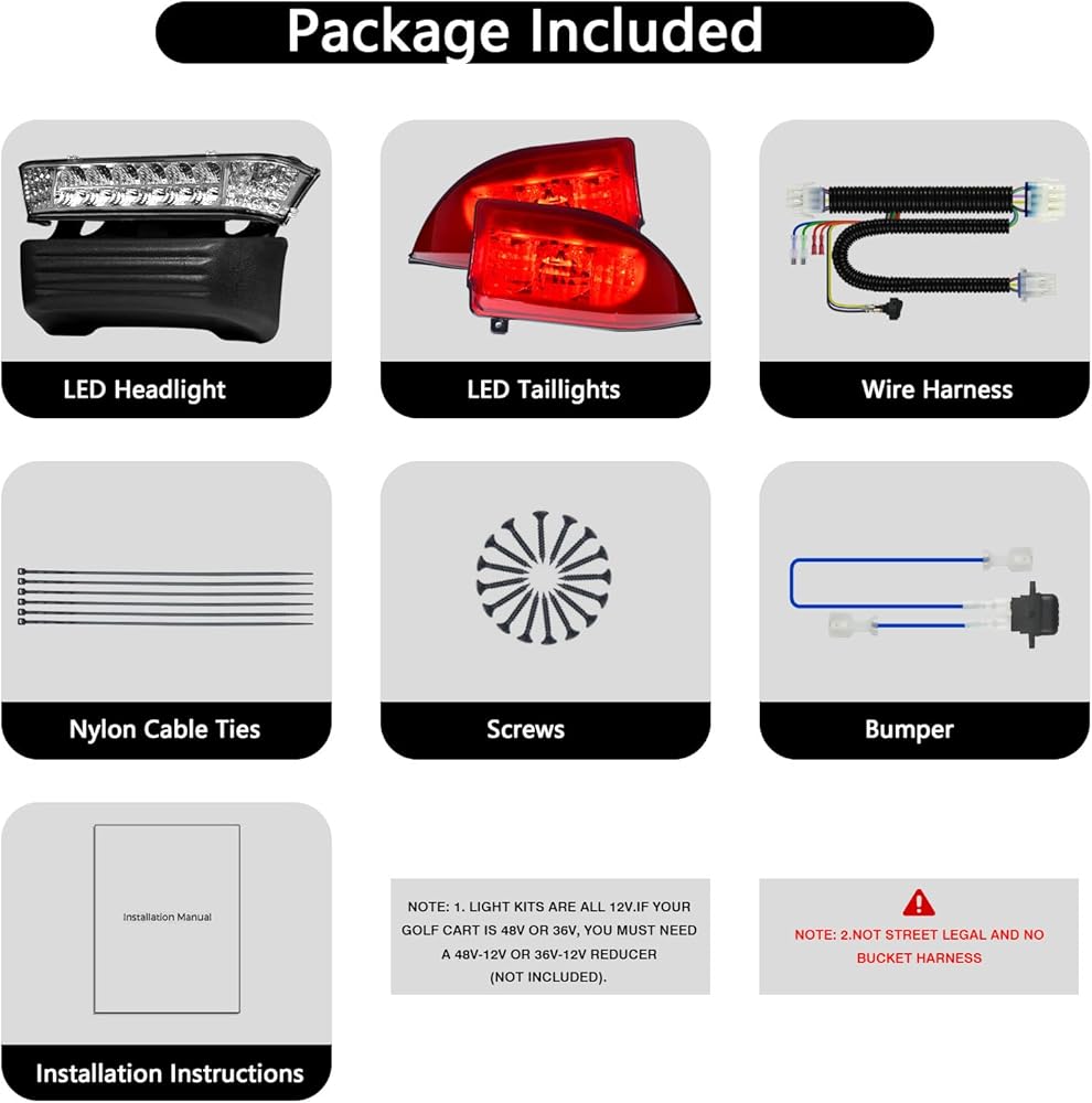 💡يستخدم جهد 12 فولت: جهد مجموعات مصابيح الجولف المتوافقة مع Club Car Precedent كلها 12 فولت إذا كانت عربة الجولف الخاصة بك 48 فولت أو 36 فولت، فقد تضطر إلى إضافة مخفض جهد 48 فولت-12 فولت أو 36 فولت-12 فولت لمنع احتراق الضوء الخروج، وإطالة عمر البطارية. (لا يتم تضمين مخفض الجهد)