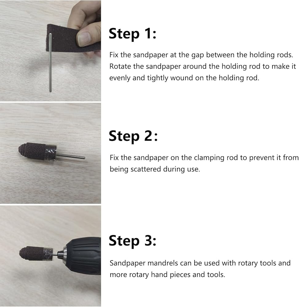 Easy Use - Just fix the sandpaper at the gap between the holding rods, rotate it around the holding rod to make it evenly and tightly wound on the holding rod, then fix it in place.